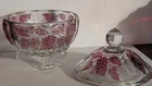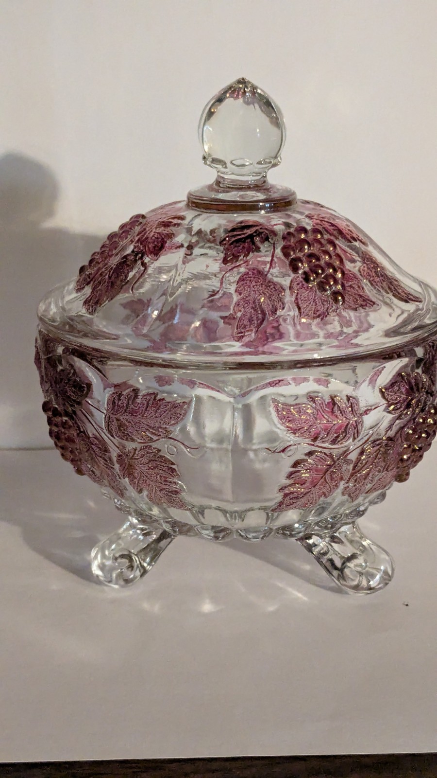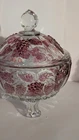The Westmoreland Vintage Clear Ruby Red Flash Grape Glass Candy Dish with Lid is a stunning piece of mid-century modern decor. Made in the United States with a pressed glass technique, this is a round pedestal dish features a ruby flash pattern and a single compartment. The vibrant red color and intricate grape design make it a perfect wedding or vintage-inspired accent piece for any home. With its authentic and original production style, this candy dish is both functional and stylish, adding a touch of elegance to any room.