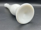 This vintage Westmoreland bud vase is a mid-century modern piece from the 1950s, originating from the United States. Handmade from white milk glass, it stands at 10.75 inches tall on a pedestal base. The vase features a hand-blown swung design with a glossy finish, making it a decorative and elegant addition to any space. Perfect for displaying flowers, this original piece embodies the charm and craftsmanship of mid-20th-century glassware.