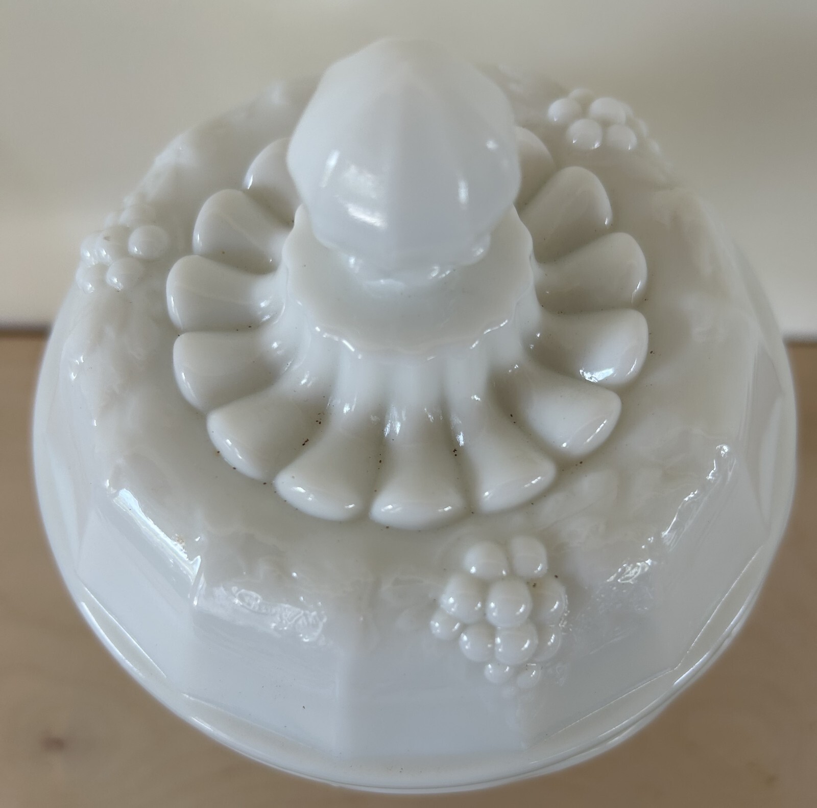 This vintage compote dish is absolutely stunning! The delicate grape pattern and milky white glass give it such an elegant, timeless look. Perfect for displaying candies, trinkets, or even as a standalone decor piece. The pedestal base adds a touch of sophistication, and the lid keeps contents fresh. A beautiful addition to any home!