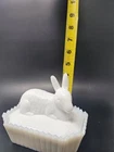 The Vintage Westmoreland White Milk Glass Rabbit On Nest Soap Dish is a charming and decorative piece featuring a rabbit shape covered dish made of milk glass. This soap dish showcases the brand's attention to detail with its impressed backstamp and adds a touch of vintage flair to any room with its unique design. The white color and rabbit theme make it a lovely addition for those who appreciate classic and elegant decor pieces. See photos there is a small chip, other than that it is in perfect condition.