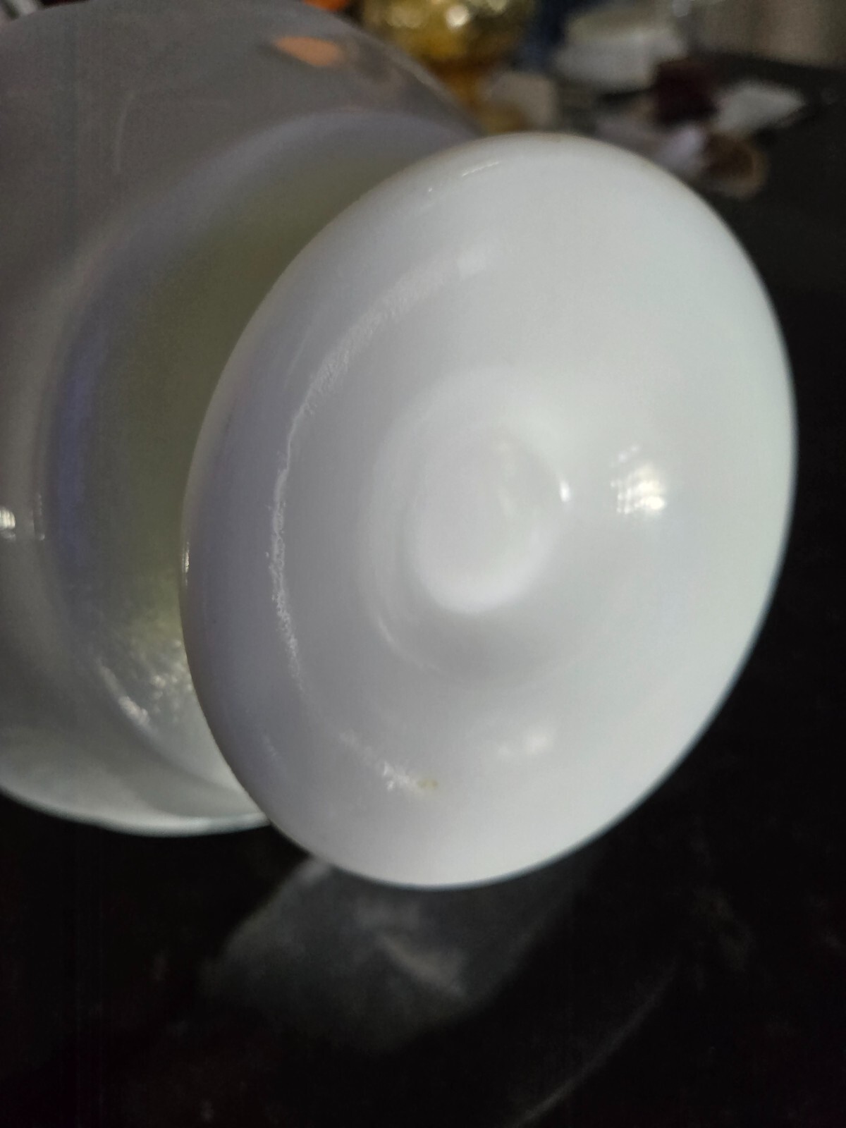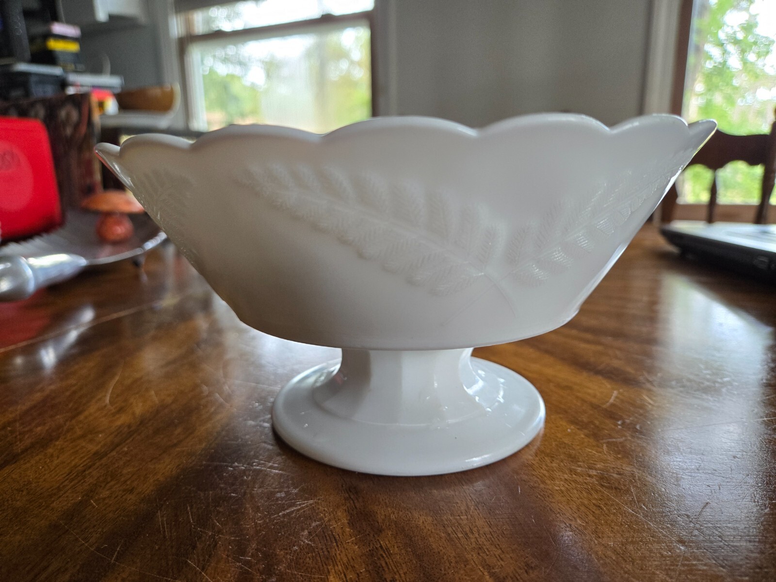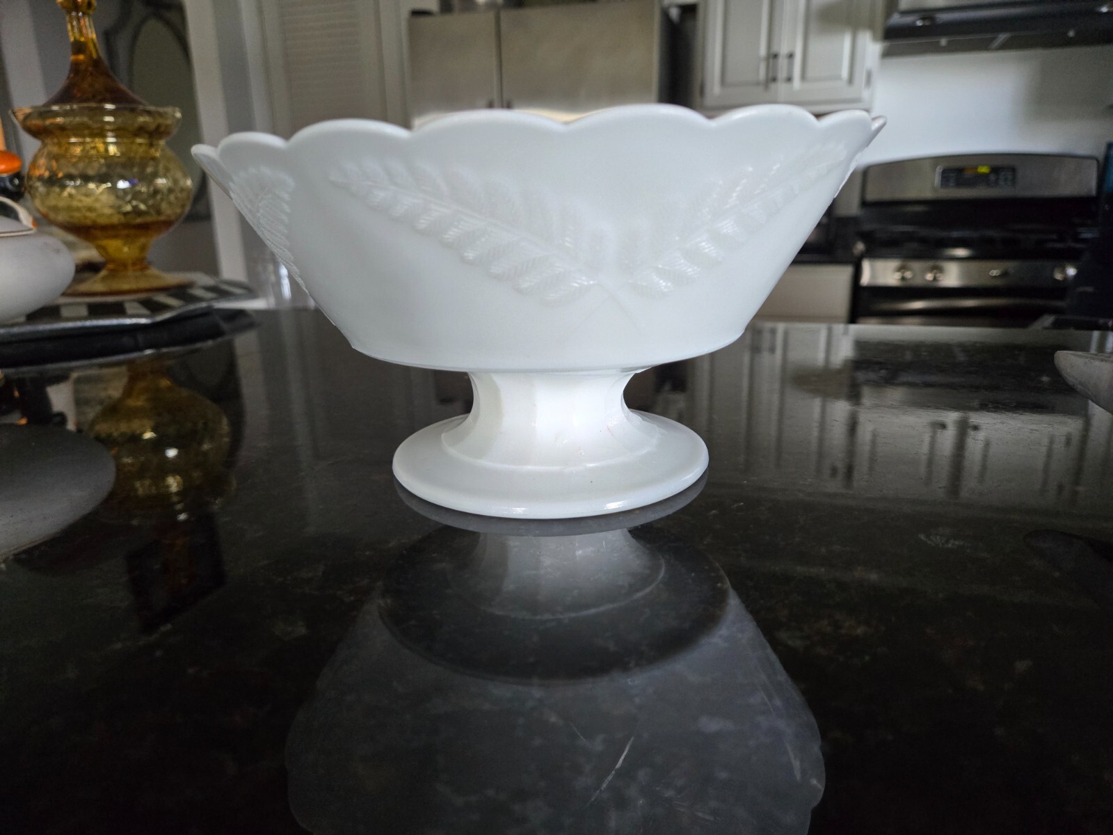 Vintage White Milk Glass Scalloped Pedestal Serving Bowl with Leaf Design