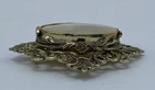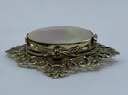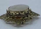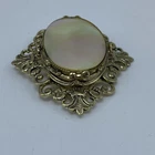 This beautiful vintage Victorian brooch pin by Whiting & Davis features a stunning oval-shaped mother of pearl stone in a bezel setting. The cream-colored shell is complemented by a gold-tone metal frame, creating an elegant and timeless piece of jewelry. The brooch is in excellent cut grade and the natural creation of the main stone adds to its value. This brooch pin is perfect for those who appreciate antique and vintage jewelry. It has a stackable feature and it is manufactured in the United States. The exterior color is multicolor and it is suitable for any occasion. Get your hands on this unique and exquisite piece of jewelry today!
