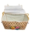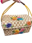 This Vintage Wicker Rattan Straw Handbag is a stylish retro piece perfect for various occasions such as travel, party, casual outings, and workwear. The wicker and colored straw exterior, along with the yellow top handle, gives it a unique and classic look. The lined interior with vinyl material makes it practical for everyday use. Handmade in the Philippines, this medium-sized handbag with woven flowers adds a touch of beachy and 60s-inspired charm to any outfit.