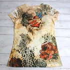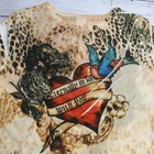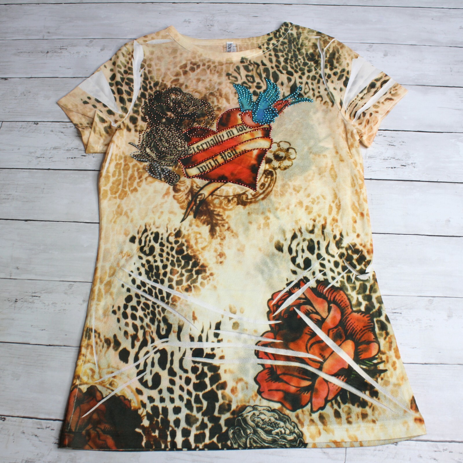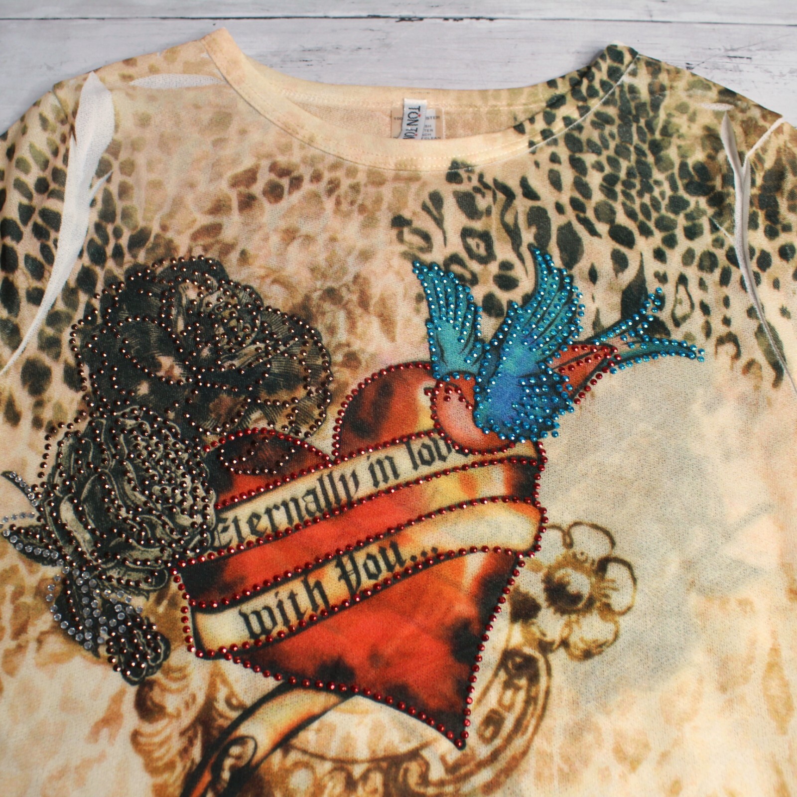 New with Tags Ton Ton Vintage Tattoo Art Graphic T Shirt Top Eternally in Love with You Animal Print Love Heart Roses Rhinestone Embellished Main Colors: Cream Tan Black Red Turquoise Blue White Short Sleeve 100% Polyester Made in USA Hand Wash Labeled Women's Size L Large - Runs small and may fit size M Medium best. Retail $42.00 This snug fitting short sleeve graphic t-shirt top is tan, white and black animal print with black roses, a red heart and turquoise blue bird with faux rhinestone studded embellishment. The top is lightweight and made of see through mesh. It is vintage and is brand new with tags. Please know it runs small so please base fit on measurements provided. Approximate Measurements Bust 16 1/2" across from armpit to armpit, lying flat Length 27" from shoulder to hem Goth Gothic Grunge Punk Steampunk Bling Embellished Studs Studded Rhinestones Jewel Graphic