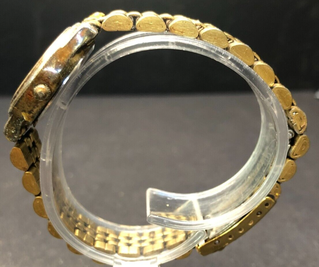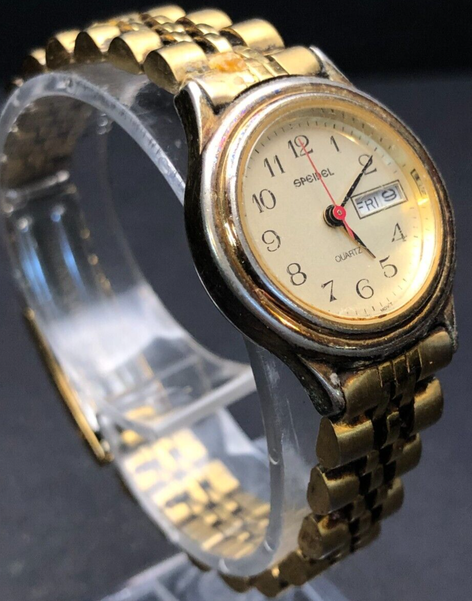 Style: Casual Movement: Quartz With Papers: No With Manual/Booklet: No Handmade: No Dial Pattern: Logo Year Manufactured: Unknown Model: Analog Watch Bezel Type: Fixed Type: Wristwatch Case Color: Gold Number of Jewels: No Jewels Features: 12-Hour Dial, Day/Date, Water-Resistant Customized: No Seller Warranty: No Max Wrist Size: Unknown Case Finish: Polished Case Thickness: Unknown Indices: Arabic Numerals Vintage: Yes With Service Records: No Case Size: Unknown Band Material: Stainless Steel With Original Box/Packaging: No Band Color: Gold Band/Strap: Bracelet Country/Region of Manufacture: Unknown Dial Color: Gold Brand: Speidel Bezel Color: Gold Closure: Buckle Handedness: Right Band Width: Unknown Theme: Classic Lug Width: Unknown Display: Analog Case Material: Stainless Steel Department: Women Water Resistance: Unknown Watch Shape: Round Manufacturer Warranty: 1 Month Caseback: Solid