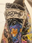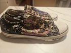 Elevate your style with these vintage Ed Hardy Aviator Skull Sunrise slip-on canvas shoes. Featuring a colorful skull and cherry blossom design, these sneakers are perfect for any casual or activewear occasion. The pull-on closure and low-top shoe shaft style make them easy to wear, while the rubber outsole and moderate cushioning level provide comfort and support. These shoes are a size 7 and have a standard shoe width, with a canvas upper material and foam insole material. The Ed Hardy brand is known for its unique designs and high-quality products, making these shoes a must-have for any sneaker enthusiast. Whether you're walking, skateboarding, dancing, or going to school, these shoes are a great addition to any wardrobe.