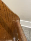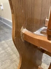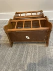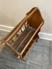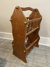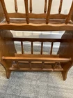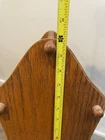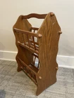 Cool vintage piece made of real wood and particle board. The frame and spindles are wood but the bottom of each book holder seems to be particle board. 24 inches tall with a sturdy handle for ease of handling. The last 3 photos show a few flaws but it is in good overall vintage condition. Could use a good cleaning due to being in storage.