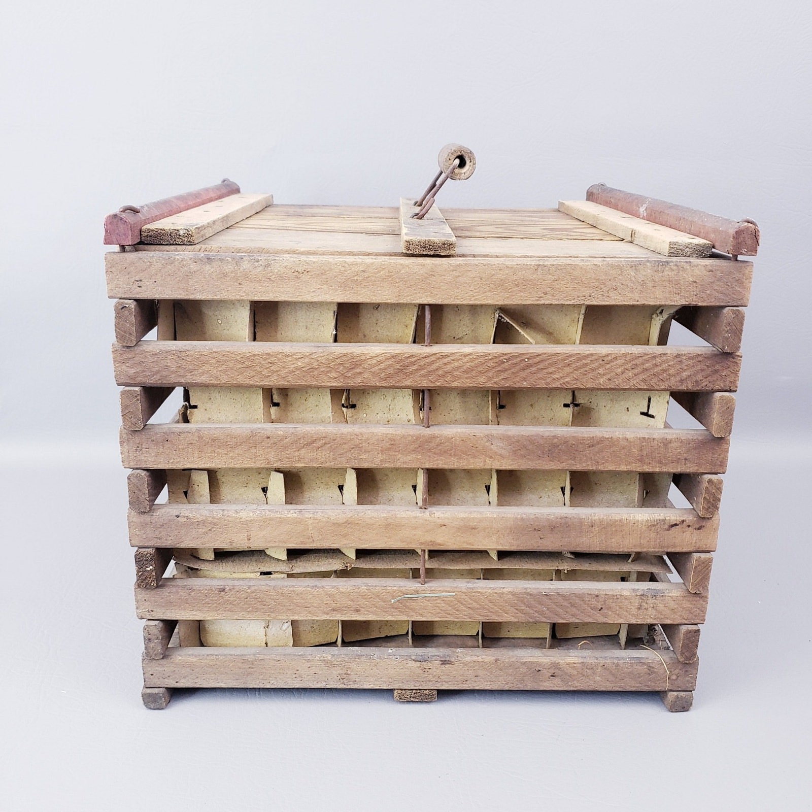 Vintage Wood Egg crate Humpty Dumpty Cummer Mfg. Cadillac Michigan Wooden crate is in great structural condition. Lid is secure and unit carries well. Paper egg grids show their age with rips, stains, dirt, dust, and one missing row. Original Humpty Dumpty logo is very faded. Over all very nice condition for its age. Please see the examples provided in the listing photos. Holds 12 dozen eggs. Measures approximately 13"x13"x11". Thank you for looking!