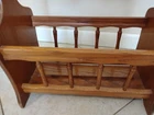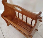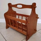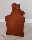 This vintage magazine holder is made of wood in a colonial heritage style from the 1970s. It has a single compartment, brown color, and a polished finish, this free-standing rack weighs 3.5 lbs. Assembly is not required for this original retro piece. Has some wear from age and use very nice piece! See pics for condition