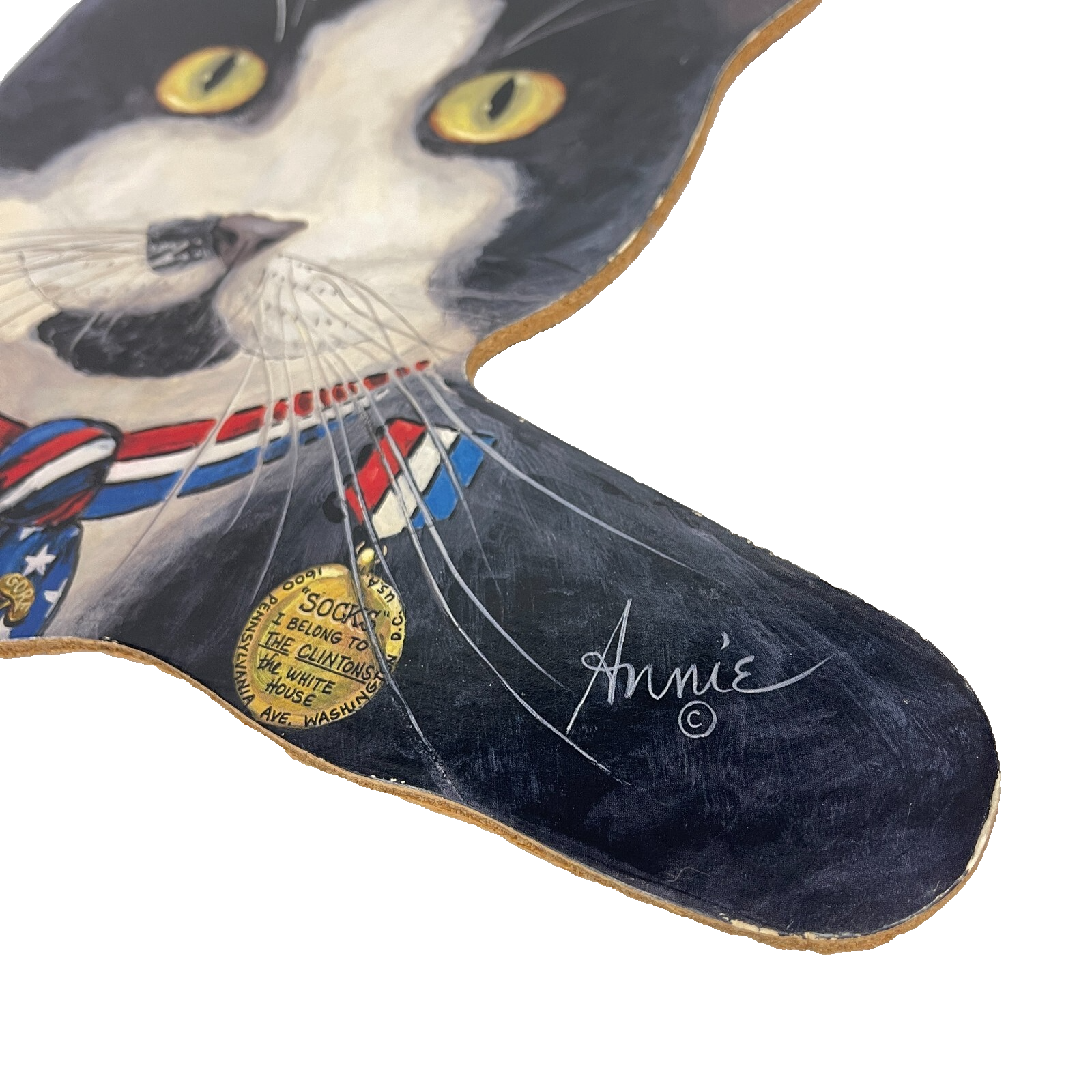 Vintage Cat Clothes Hanger (one) circa early '90s "Socks" presidential cat to The Clintons jigsawed plywood w/decoupaged(?) cat illustration, metal hanger can completely rotate/swivel in all directions wood piece is aprx 12" tall; see pics for scale made in the USA by Stupell in Johnston, Rhode Island/ 401-831-5640 Part of a series of cat themed clothes hangers from Stupell, designed by Annie Rhinehart (we have four different ones for sale -all sold separately/ last photo shows all together but only first one is included in THIS sale) pre-owned, vintage condition w/minor cosmetic & edge wear w/ slight production imperfections