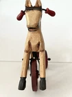 Vintage Wooden & Metal hand carved Horse Folk Art Horse Tricycle Saddle Stirrups The size of this piece is about 8 inches long by about 7.5 inches tall . Found at an Estate sale , could be Antique but for sure Vintage . This horse is in great condition and the wheels all turn. A fun piece of Folk Art .