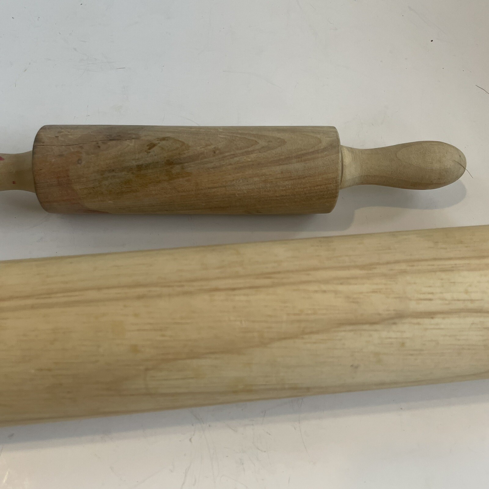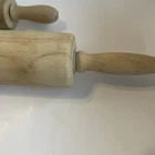 The product is a set of 2 vintage wooden rolling pins made of solid wood with a plain design. Each rolling pin features a barrel and rolling handles, both crafted from wood. With a length of 17 inches and a handle for easy grip, these rolling pins are ideal for various baking and cooking tasks. Suitable for all occasions, this set of vintage wooden rolling pins would be a charming addition to any kitchen, particularly for those who appreciate traditional kitchen tools. See photos for condition they are used