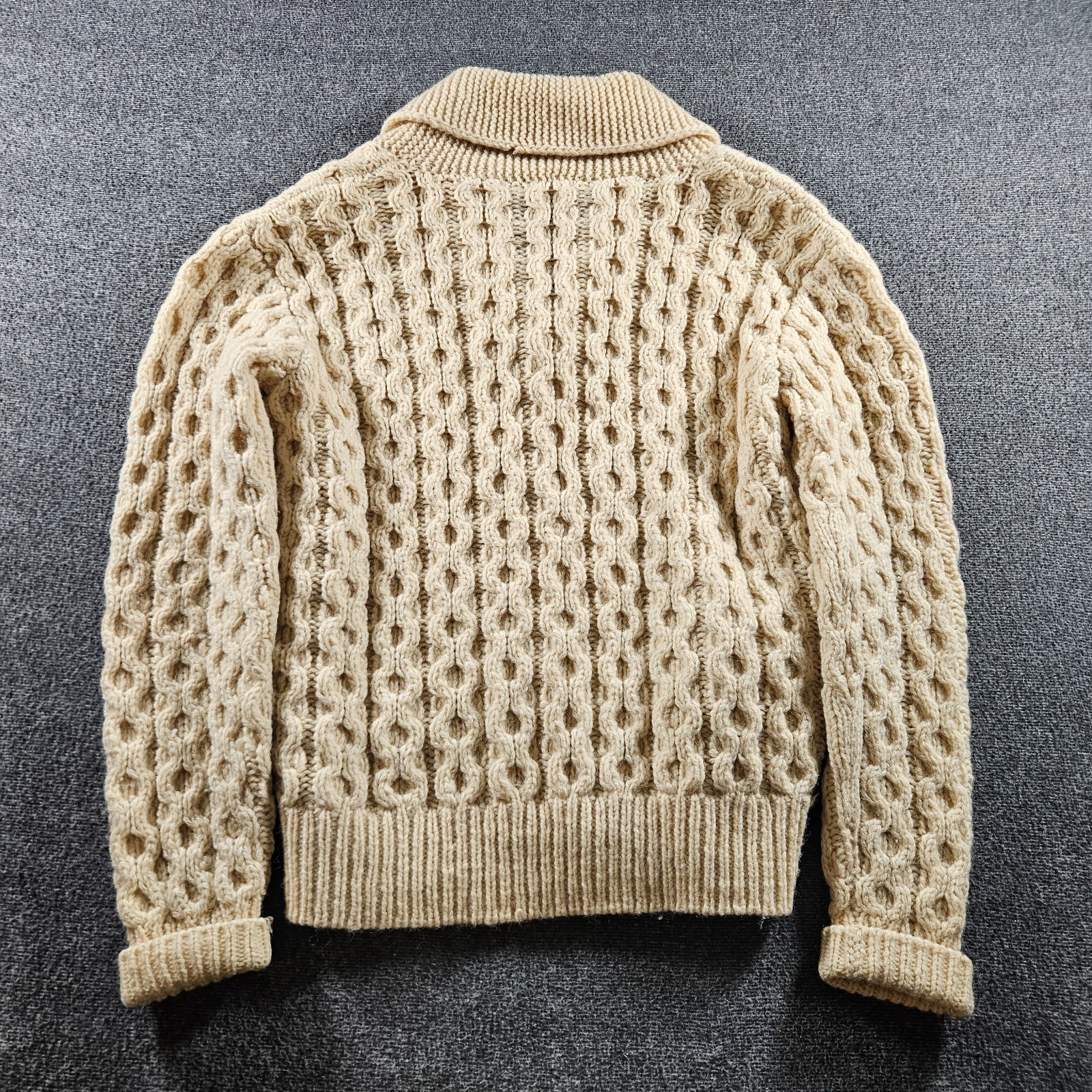 This Vintage Wool Shawl Cardigan Sweater by Atkinson is a classic piece that exudes a timeless charm. Made from cozy wool, this size medium sweater features a beige color and a knit fabric type. With a vintage appeal and a button accent, this cardigan is perfect for casual occasions during the winter, fall, and spring seasons. The long sleeves and shawl collar add a touch of sophistication, making it a versatile addition to any man's wardrobe.