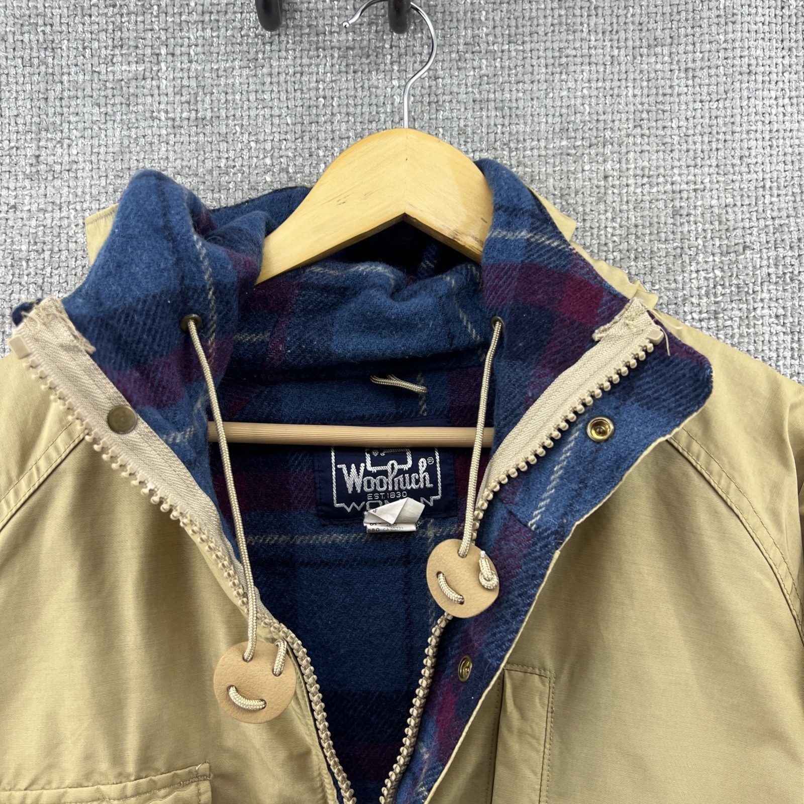 Vintage Woolrich Jacket Women’s XL Beige Chore Coat 80s Wool Lined Made In USA Wool Lined body and hood Arms are lined halfway from the shoulder See pictures for details and measurements No Returns