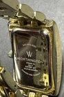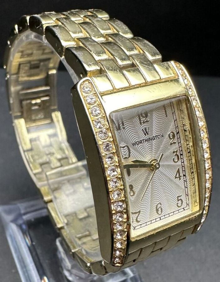 Display: Analog Department: Women Max Wrist Size: Unknown Band Material: Stainless Steel Case Thickness: Unknown With Original Box/Packaging: No Case Material: Stainless Steel Band Color: Gold Bezel Type: Diamond, Fixed Seller Warranty: No Band Width: Unknown Vintage: No Number of Jewels: No Jewels Case Finish: Polished Water Resistance: Unknown Lug Width: Unknown Dial Color: Silver Brand: Worthington Dial Pattern: Logo Watch Shape: Rectangle Year Manufactured: Unknown Indices: Arabic Numerals Case Color: Gold Customized: No Movement: Quartz Closure: Buckle Case Size: Unknown Theme: Classic Bezel Color: Gold Features: 12-Hour Dial With Papers: No Country/Region of Manufacture: Unknown Caseback: Solid Handmade: No Manufacturer Warranty: 1 Month Model: Analog Watch Style: Casual Type: Wristwatch Band/Strap: Bracelet With Manual/Booklet: No With Service Records: No