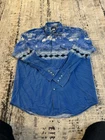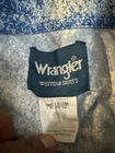 This Vintage Wrangler Shirt is a men's size XL with a Western Aztec print and pearl snap closures. The shirt features a collared neckline with a point collar style, long sleeves, and a regular fit. Made of cotton knit fabric, it is designed for all seasons and easy care, with a blue geometric pattern. This hipster Western shirt from Wrangler is perfect for travel, casual wear, or workwear, adding a touch of cowboy, Aztec, and bohemian style to any outfit.