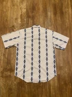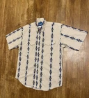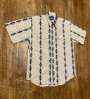 This Vintage Wrangler Western Cowboy Aztec Pearl Snap Button Up SS Shirt in size Large is a classic piece of men's clothing with a Western theme. The shirt features a collared neckline with a spread collar style, short sleeves, and a geometric pattern in multicolor. Made from cotton fabric with a woven texture, this button-up shirt is machine washable and easy to care for. Perfect for casual occasions in all seasons, this shirt also boasts a unique pearl snap button closure and a regular fit for added comfort. Ideal for those who appreciate vintage style and iconic cowboy fashion.