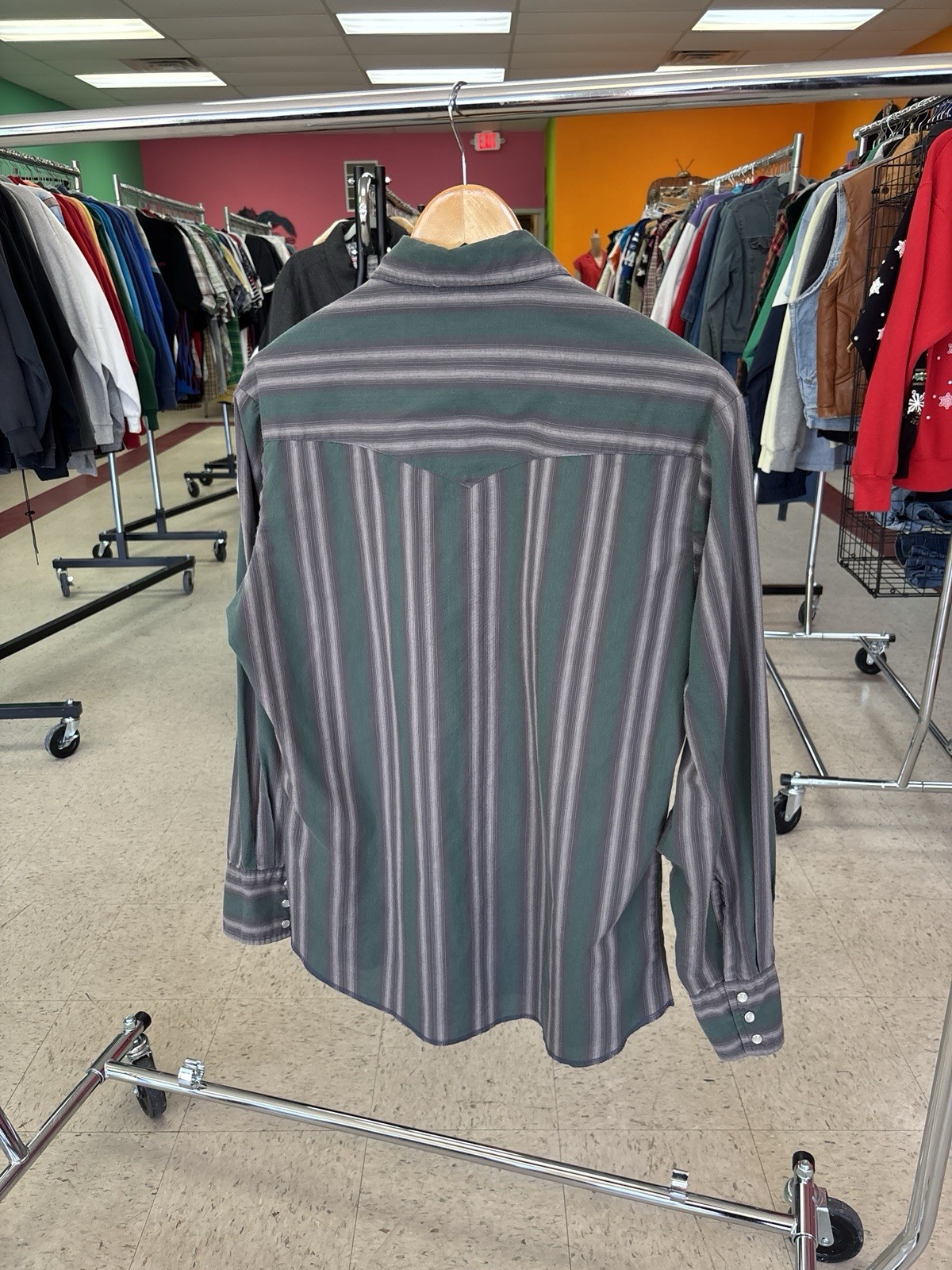 The Vintage Wrangler Western Long Sleeve Snap Shirt in green features medium square stripes, a collared neckline, and snap closure. Made of breathable cotton fabric, this button-up shirt is perfect for casual or workwear occasions. With its classic Western theme, this shirt is easy to care for and lightweight, making it suitable for all seasons. The Wrangler brand adds quality and authenticity to this timeless piece, which is machine washable for added convenience.