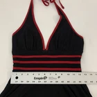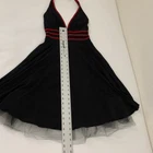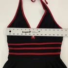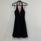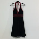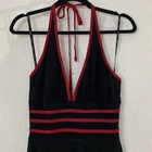 - XOXO Mini Dress Women Medium Black with Red Ribbon Stripe trim Halter Tie Closure Open Back Deep VNeck Lining has tulle trim Made in USA Pit to Pit 14" Waist 12.5" Center to outer hem 25" Tags: Y2K 90s Retro Whimsygoth Goth Emo Punk Pinup Sexy Homecoming Hoco Club Party Going Out rockabilly Whimsy Gothic dainty dark mysterious whimsical folklore enchantment fantasy whimsigoth fairy grunge stevie nicks goth cyber funky preppy feminine glam dance wedding guest 02543