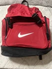 This vintage Nike backpack is a must-have for any sneakerhead. The red canvas material is accented with white Orange Swoosh tags, giving it a unique look. The bag features a zip and buckle closure, with adjustable straps for a comfortable fit. The medium-sized bag has a laptop sleeve for protection and organization, along with outer pockets for easy access to your essentials. The anti-theft design ensures your belongings stay secure. This backpack is perfect for casual occasions and is lightweight for easy transportation. Don't miss out on this rare find from the 2000s.
