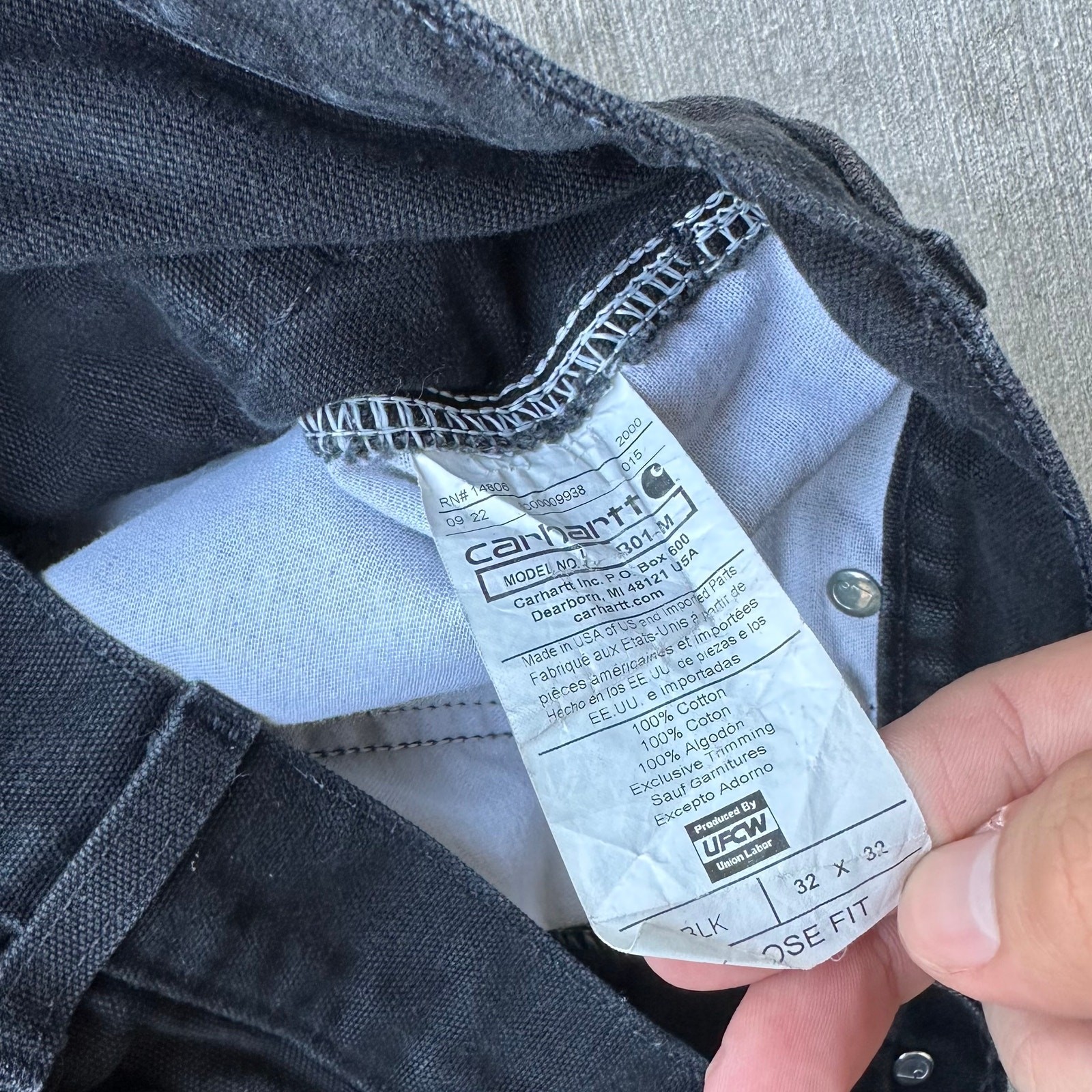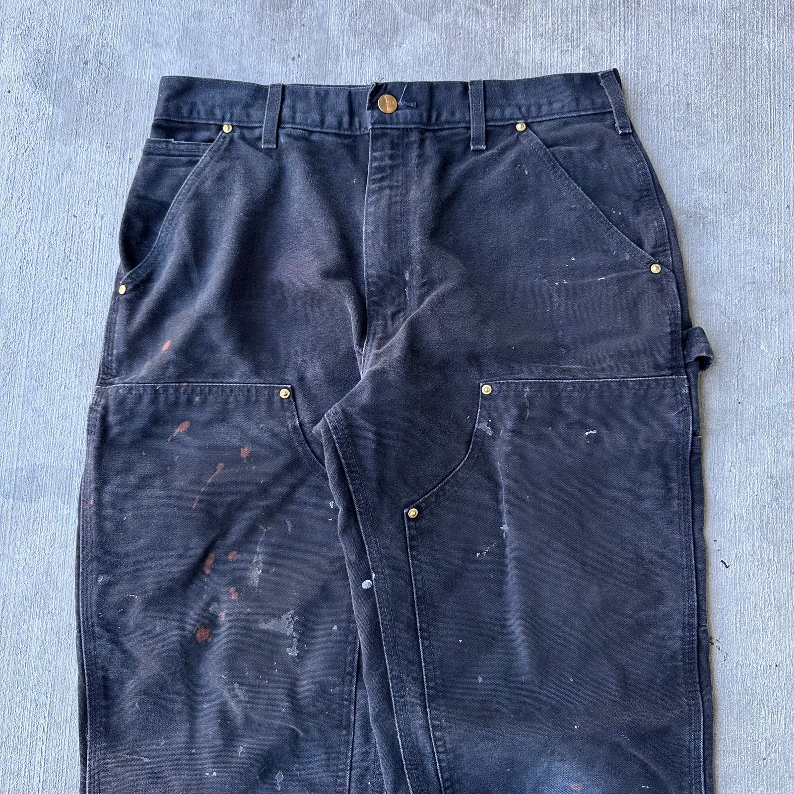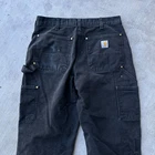 Vintage Y2K Carhartt black double knee work wear carpenter pants. Nice wear on these! Staining throughout with a hole at ankle. Measures 32x31 with a 9 inch leg opening. Please check measurements before purchasing. I do my best to show any flaws in pictures. Quick shipping! Bundles encouraged! @ants_haul on Instagram. 0938!!!