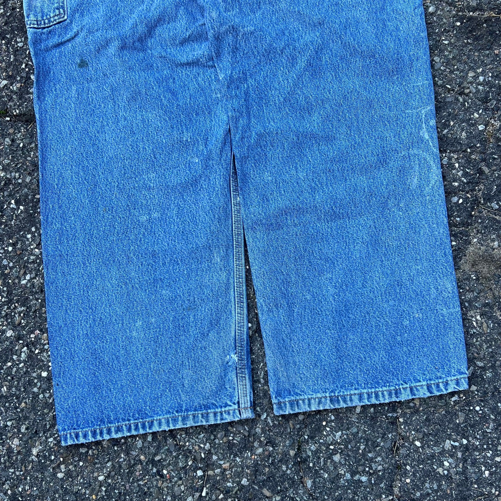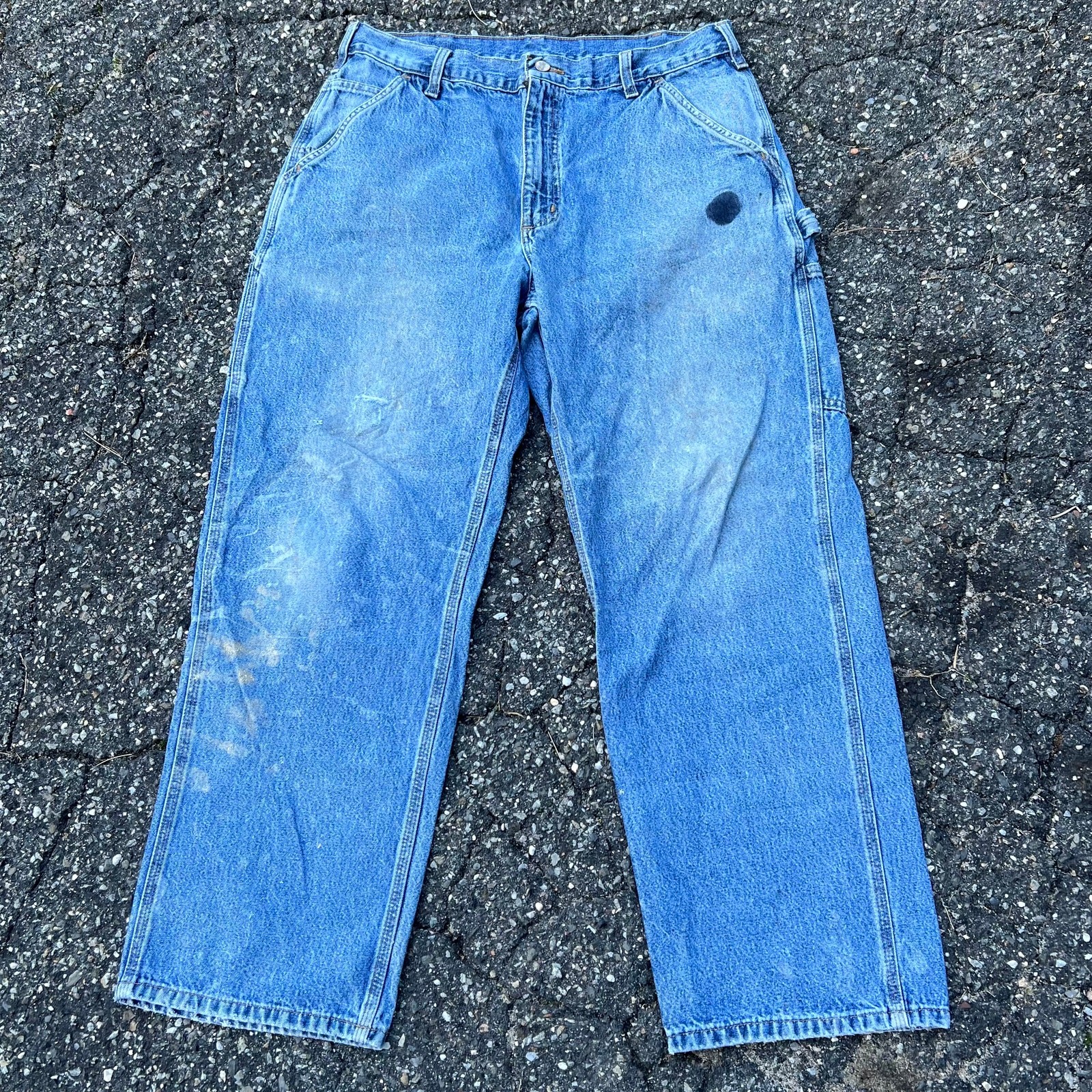 Vintage Y2K carhartt blue denim jeans work wear carpenter pants. Great pair. Measure 34x29.5 and a 9.5 leg opening. Please check measurements before purchasing. I do my best to show any flaws in pictures. Quick shipping! Bundles encouraged! @ants_haul on Instagram. 172!!!