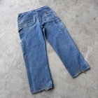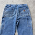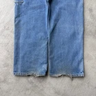 Vintage Y2K Carhartt denim blue jeans double knee work wear carpenter pants. Nice pair! Faded knees. Light staining. Missing button. Heel bite. Measures 35x29 with a 9.5 inch leg opening. Please check measurements before purchasing. I do my best to show any flaws in pictures. Quick shipping! Bundles encouraged! @ants_haul on Instagram. 0990!!!