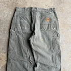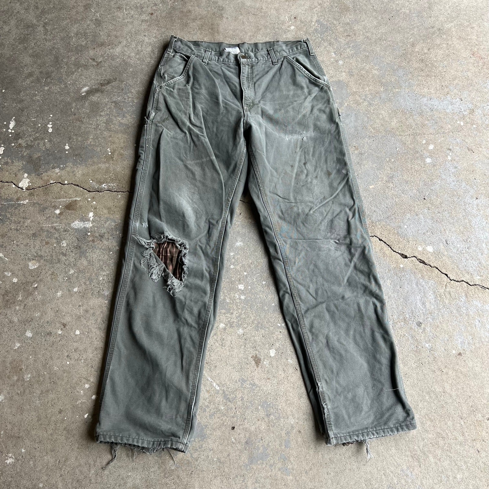 Vintage Y2K Carhartt green distressed flannel lined work wear carpenter pants. Great pair. Measure 34x33 and a 9.25 leg opening. Please check measurements before purchasing. I do my best to show any flaws in pictures. Quick shipping! Bundles encouraged! @ants_haul on Instagram.