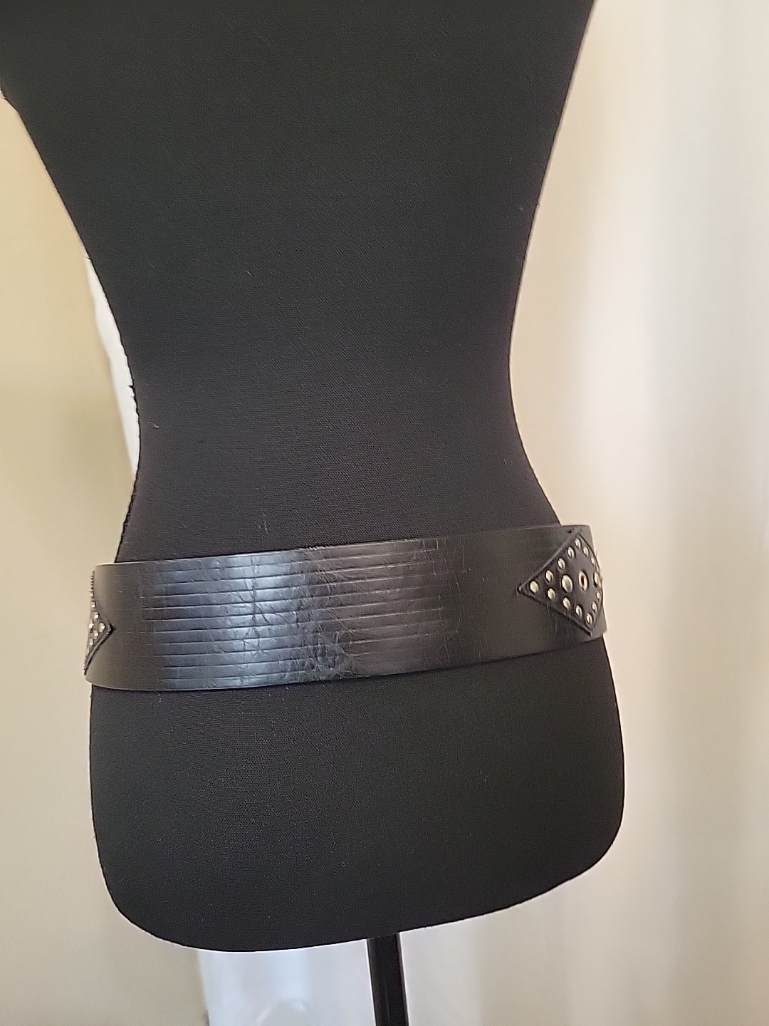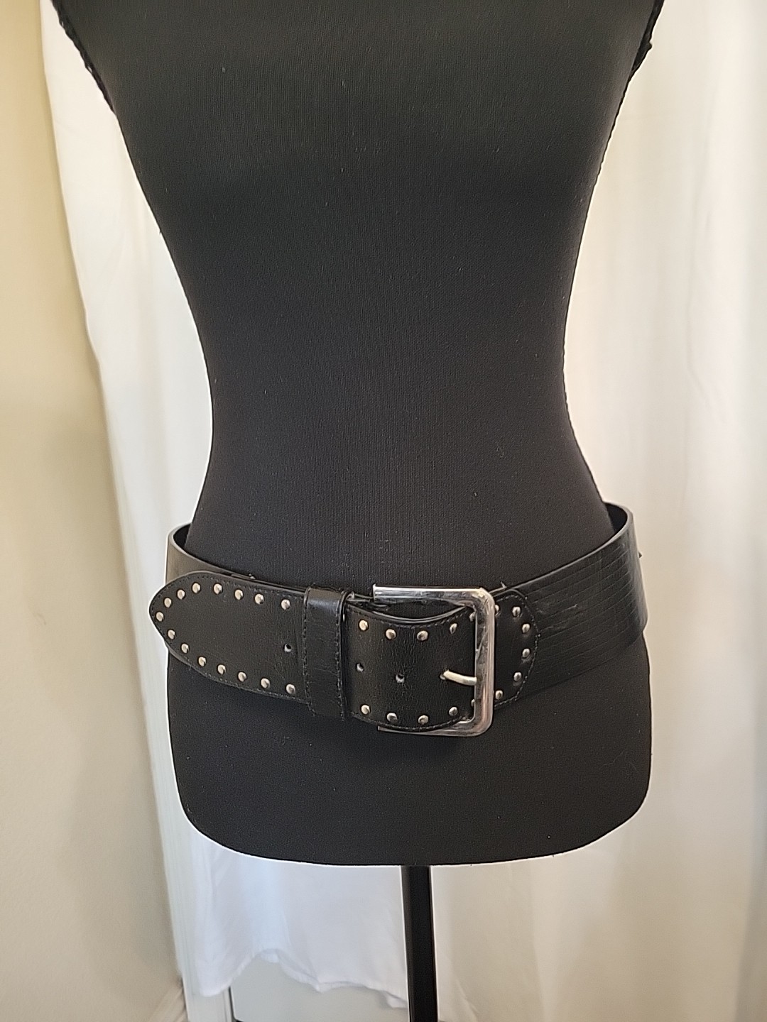 This vintage Y2K grunge black belt with silver studded designs is a stylish and edgy accessory for women. Made of faux leather, this belt features a solid black color with silver studded accents, perfect for adding a grunge-inspired touch to any outfit. The belt has a buckle closure and is designed in size L, with a waist size of 38-39 inches. Perfect for adding a punk rock flair to your look, this studded belt is a must-have for any grunge enthusiast.