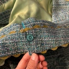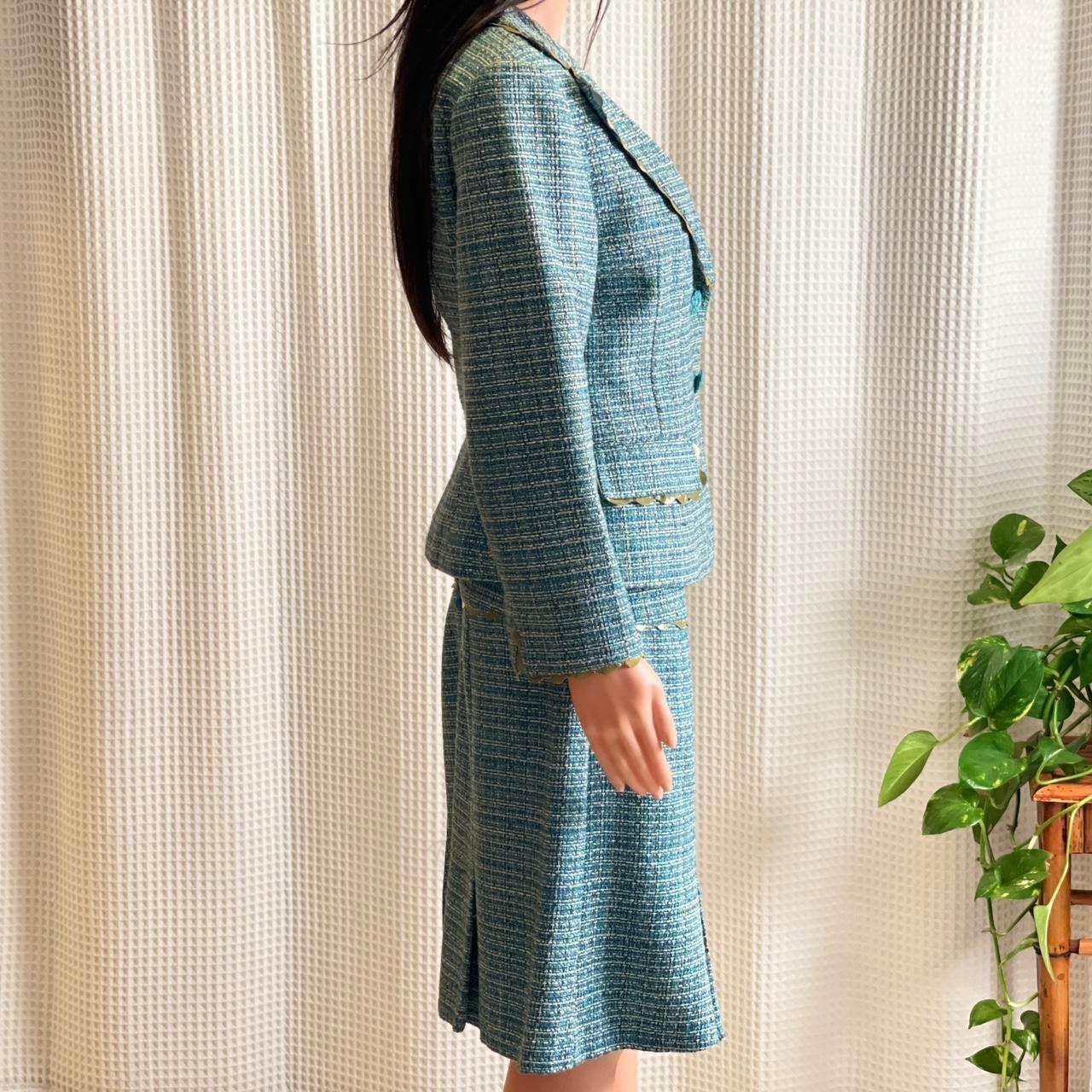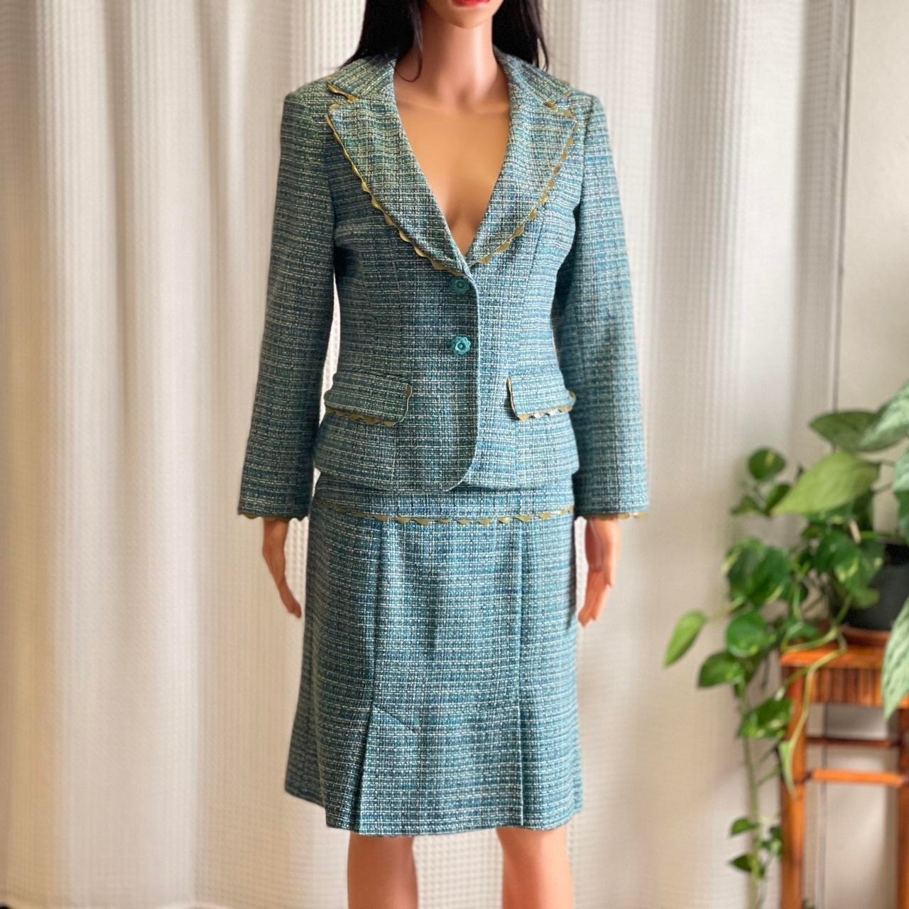 Nanette Lepore teal tweed skirt suit set. This sophisticated ensemble includes a tailored blazer with a single button closure and two flap pockets, complemented by a matching A-line skirt featuring pleating at the front. Both pieces are adorned with decorative gold trim and scalloped edges. Size: Blazer (10) and skirt (8) Condition: good; slight wear throughout and skirt is missing a button Style: Skirt Suit Department: Women Type: Suit Set Number of Pieces: 2 Piece Set Includes: Jacket, Skirt Material: Acetate, Fabric, Polyester Blend Fabric Type: Jacquard Lining Material: Acetate Occasion: Workwear, Business, Party/Cocktail Pattern: Flecked Sleeve Length: Long Sleeve Features: Lined, Tailored Keywords: Nanette Lepore, tweed suit, skirt suit, blazer set, teal suit, designer suit, professional, workwear, tailored, preppy, classic, elegant, two piece set