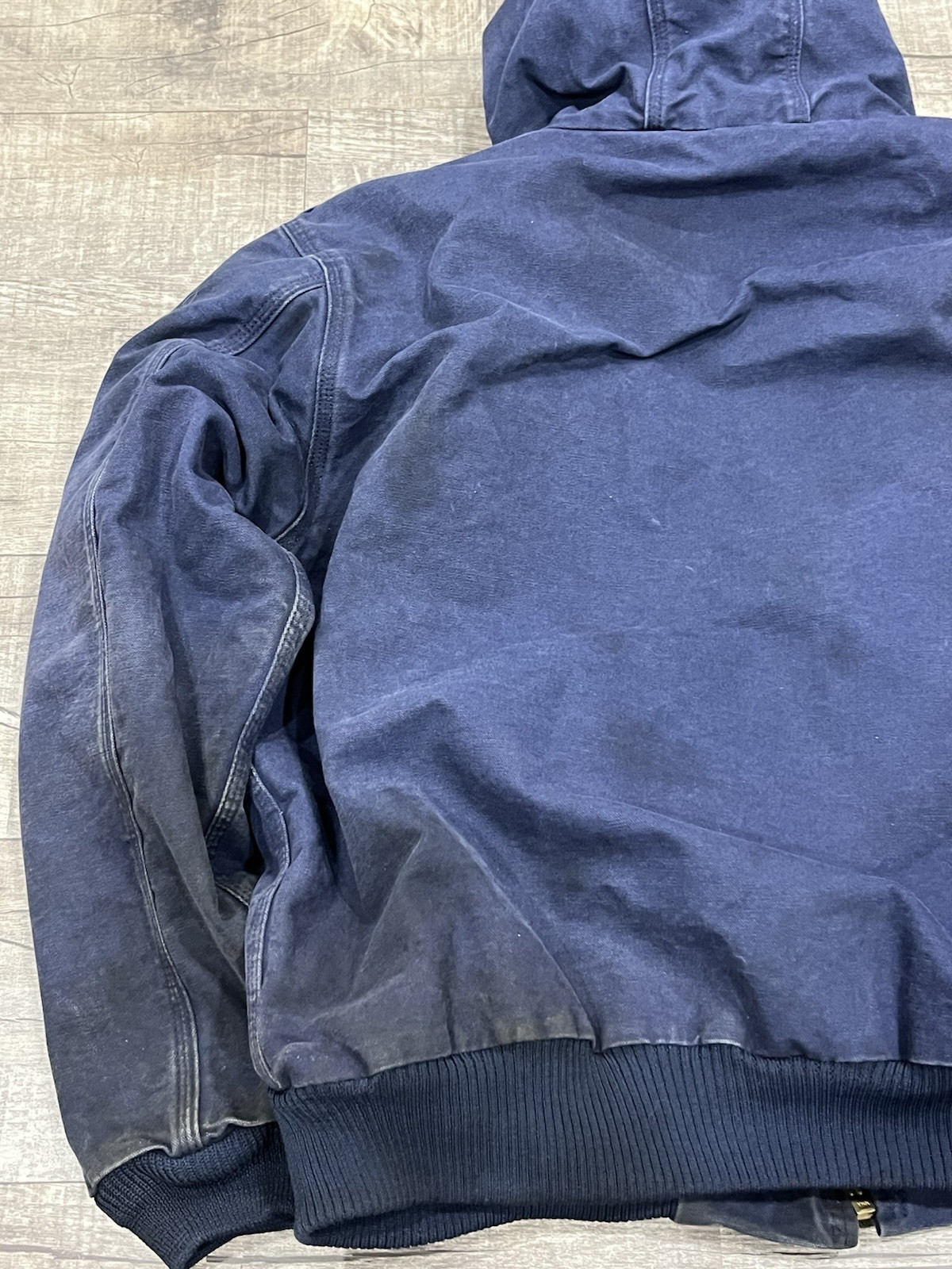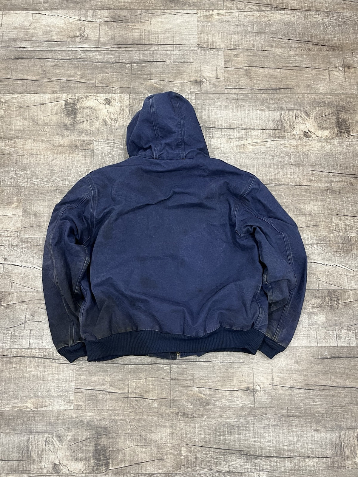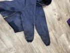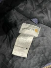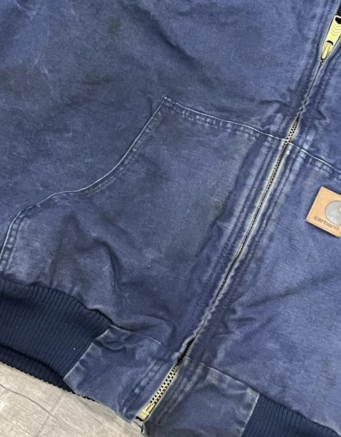 This is a vintage Carhartt hooded workwear jacket in a navy blue color. It is an XL size bomber jacket for men, made of cotton. The style is reminiscent of y2k fashion, giving it a unique and retro look. This jacket would be a great addition to any wardrobe for those who appreciate quality workwear with a touch of nostalgia. Stains on the jacket and fading can be seen throughout photos Condition 7/10