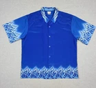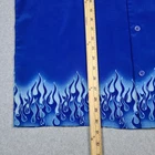 Elevate your style with this vintage Y2K No Boundaries button-up shirt. Featuring a bold graphic print with a flame and fire design, this shirt is perfect for travel, parties, and casual occasions. The short-sleeved collared shirt with a point collar style and button accents is made of lightweight and breathable polyester material that makes it comfortable to wear in all seasons. This machine-washable shirt comes in a black color and size large, fitting regular size types. It has a biker, motorcycle, hippie, punk, grunge, metal, gothic, retro, hipster, fire, Hawaiian, 70s, 80s, and 90s theme, making it a versatile addition to your wardrobe. Made in Korea, this shirt is perfect for those who want to make a statement with their fashion choices.