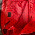 Y2K Kate Spade brown nylon messenger bag. Patent leather trim and logos, gold hardware, magnetic flap closure, red polka dot lined, one interior zip pocket, four interior slip in pockets and one external slip in pocket with magnetic closure. Adjustable crossbody strap. Measures approximately 13 x 12 x 5. Good used condition, polka dot print on lining is bleeding into the red color. Minor cosmetic wear to exterior, not noticeable when worn.