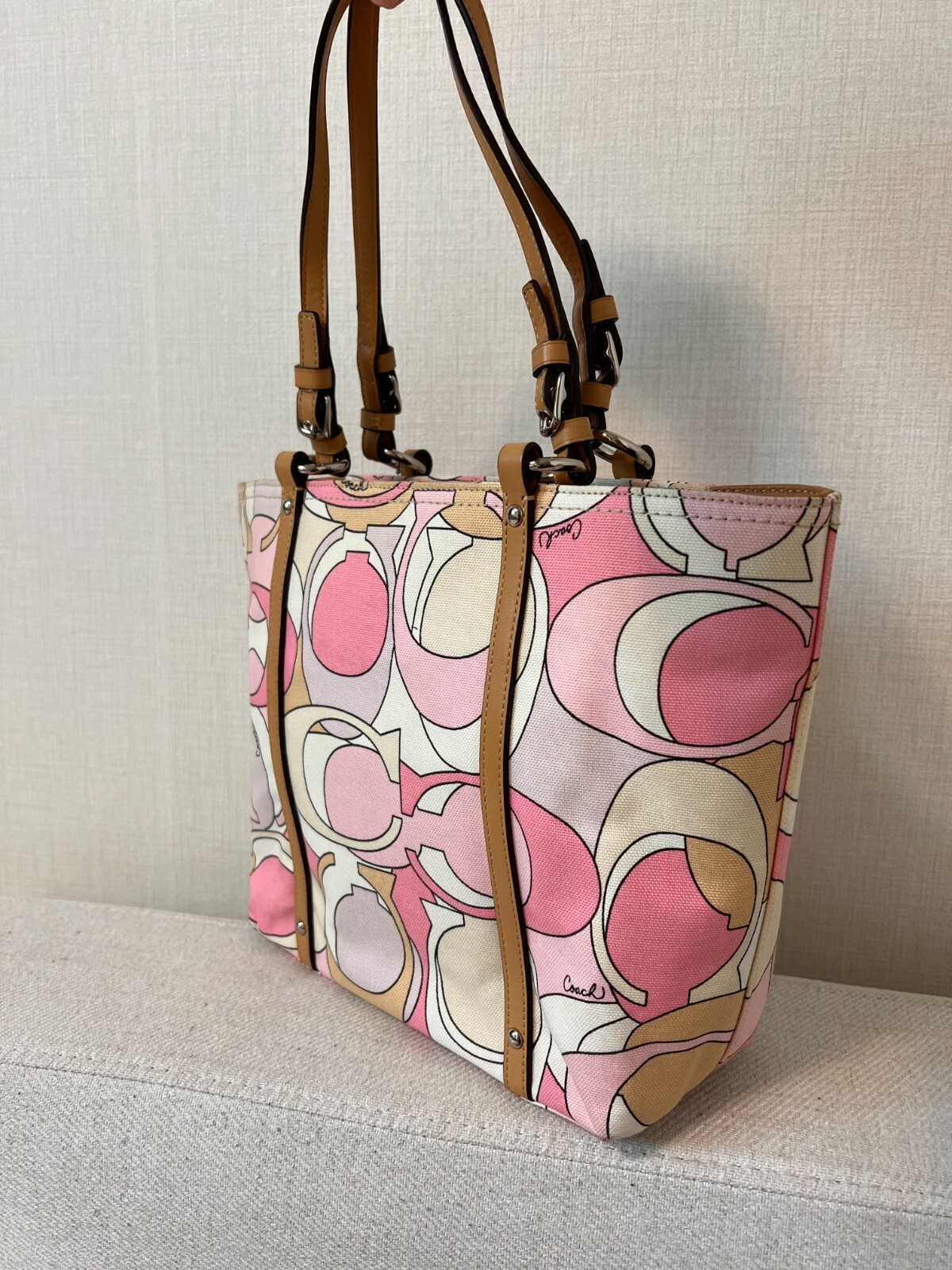 Love this cute vintage Coach tote! The pink signature canvas is so nostalgic, and the size is perfect for everyday use. The zip closure keeps everything secure, and the silver hardware adds a classy touch. Super durable and stylish—great condition for a pre-loved bag!