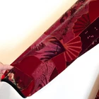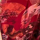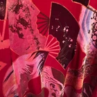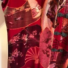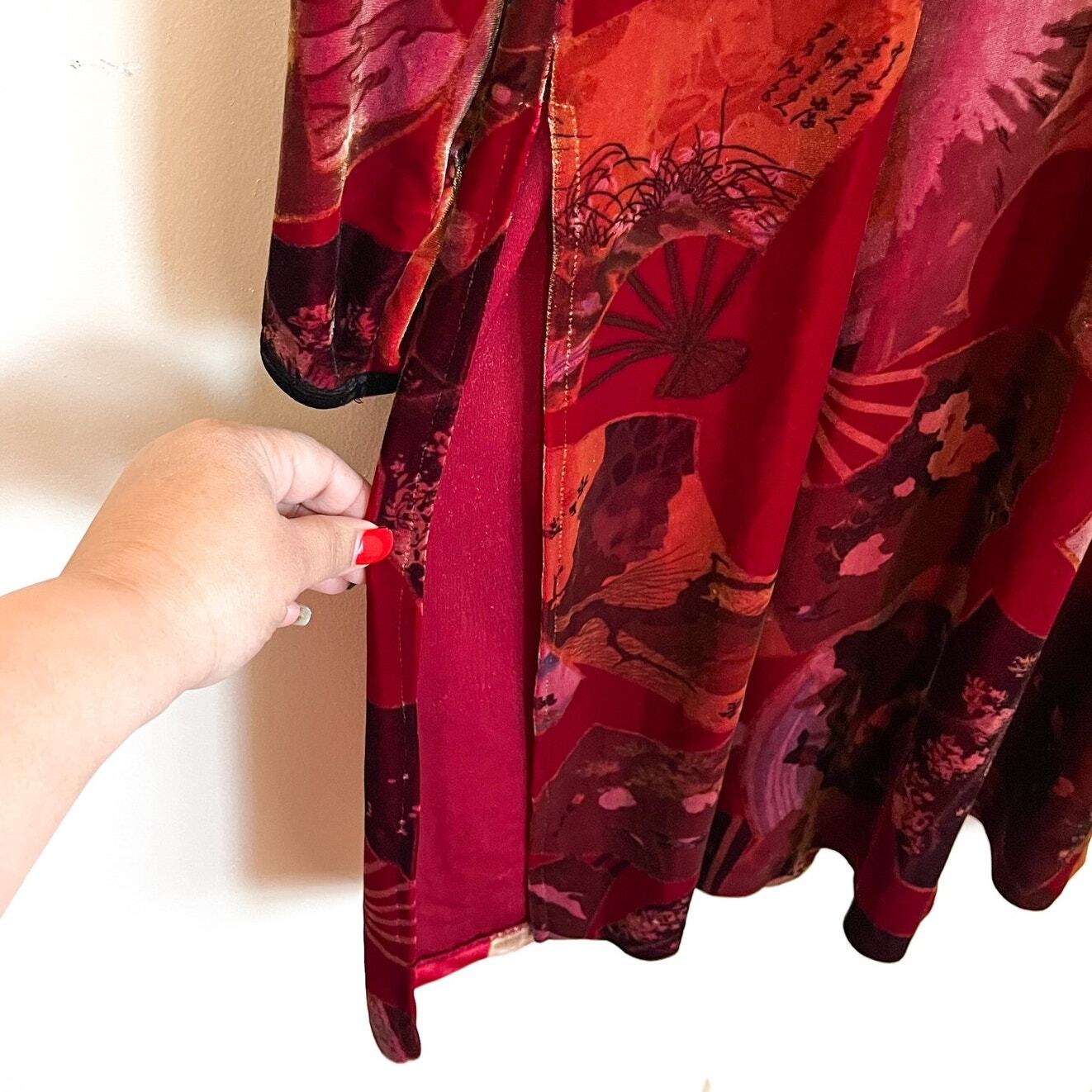 Rich Velvety 90s Y2K Art To Wear Elegant Long Line Lagom Floral Fans Graphic All Over Print Vintage Clio Asian Duster Kimono Duster Tunic Top Shirt Long sleeve Woven toggle button front closure Long side slit venting Stand up collar Red gold port bronze green colors Sz No Size Tag (est L/XL) see measurements for most accurate fit armpit 20 sleeve 23 length 41 slit 19 Good condition