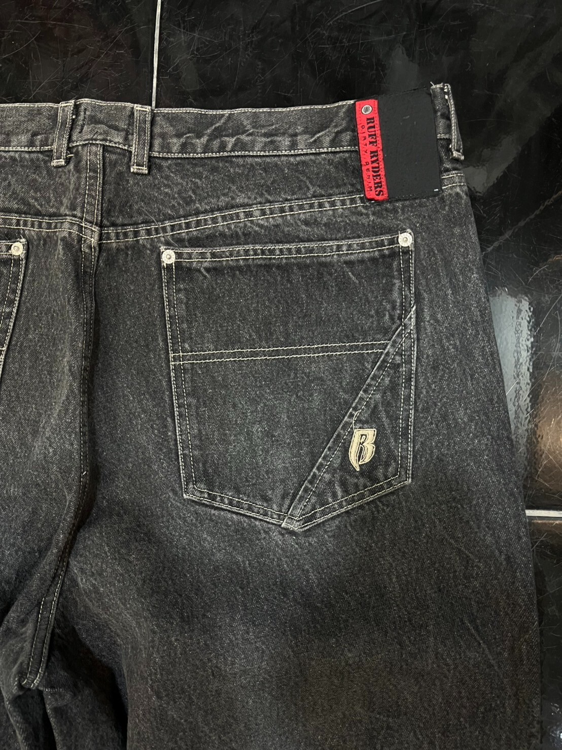 The vintage Y2K Ruff Ryder Dirty Denim Baggy Jeans are a nod to hip-hop style, featuring a wide-leg fit and a relaxed silhouette. These black denim jeans are designed with a 42-inch waist and a 34-inch inseam, making them a size 42x34. The brand is Style, and the jeans have a vintage aesthetic, perfect for those looking to add a throwback element to their wardrobe.