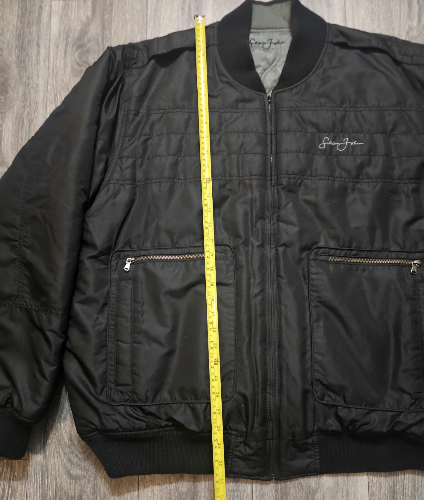 Elevate your everyday style with this vintage Sean John Aviator Bomber Jacket. The jacket features a stand-up collar and full zip closure with a reversible black and gray color scheme. The softshell fabric type with quilted accents and logo detailing adds a touch of sophistication to the mid-length jacket. Perfect for fall and winter, the jacket is insulated with polyester and lined with nylon for added comfort. The classic fit and softshell fabric make this jacket suitable for casual occasions. The jacket is a size 2XL and is made in Vietnam.