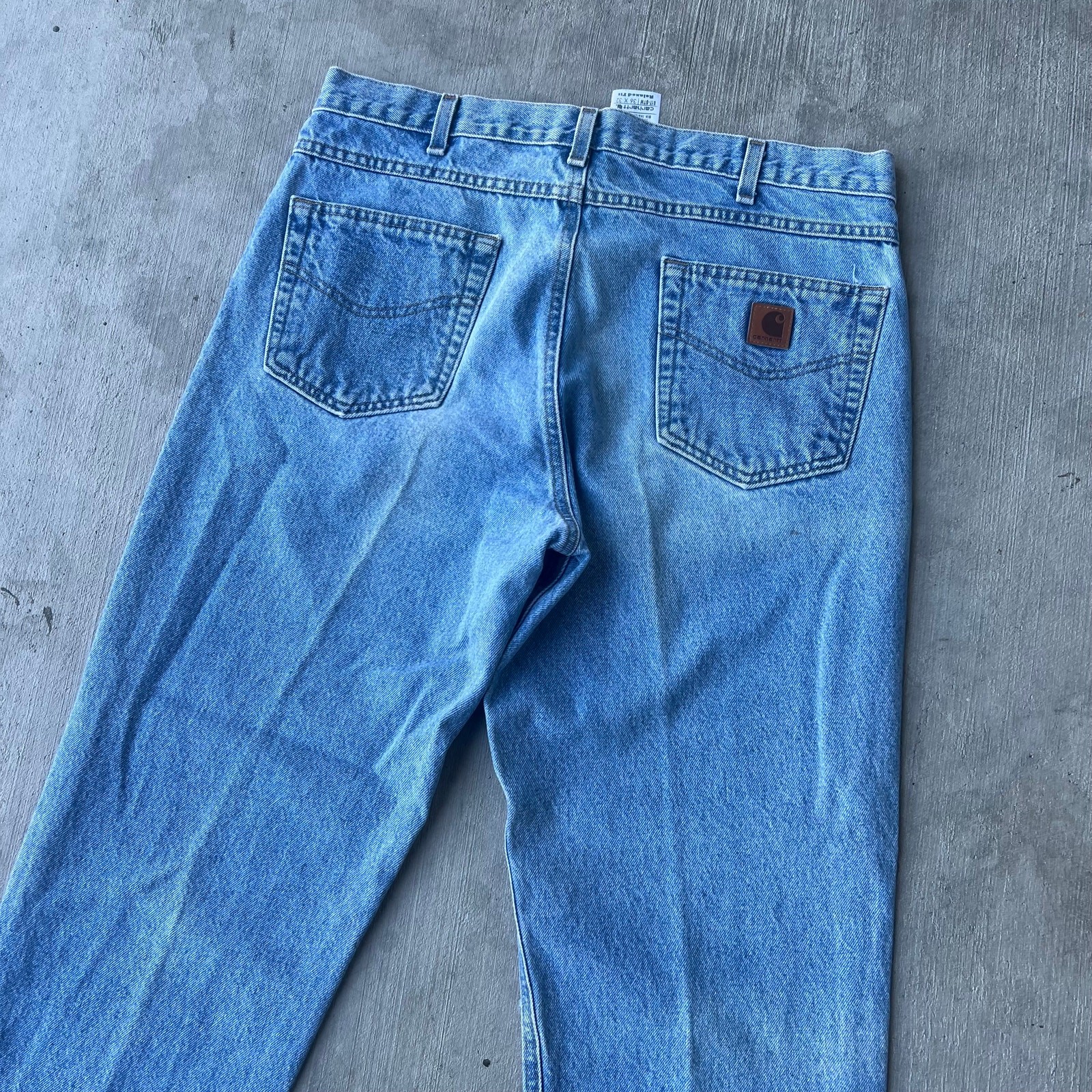 Vintage Y2K carhartt blue denim jeans work wear carpenter pants. Nice pair. Measure 36x30 and a 8.75 leg opening. Please check measurements before purchasing. I do my best to show any flaws in pictures. Quick shipping! Bundles encouraged! @ants_haul on Instagram. 1773!!!