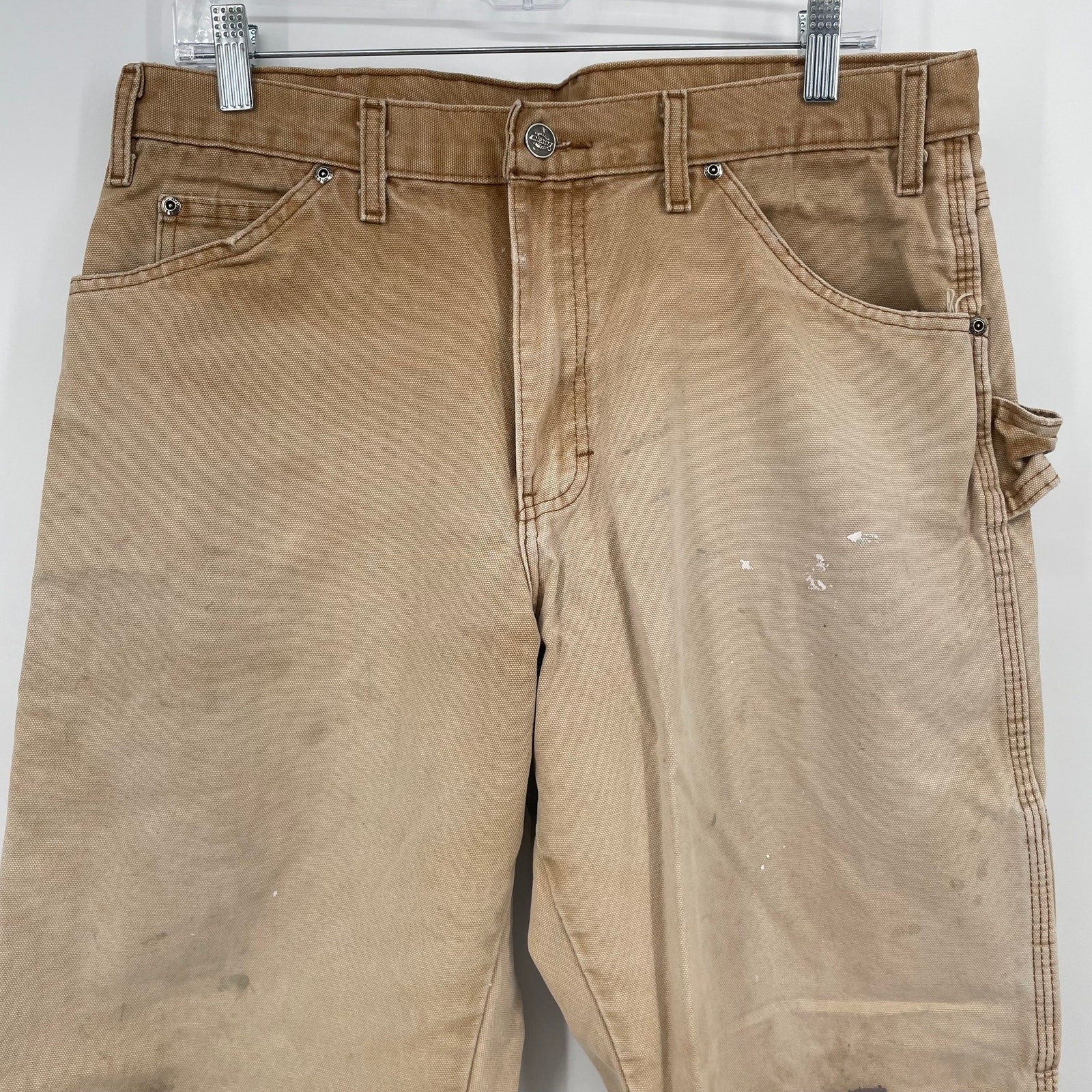 Vintage y2k men's tan canvas distressed Dickies carpenter utility painters faded work pants Waist: 33" Inseam: 29" Hip: 44" Rise: 11.5" Tag Size: 34x30 *Has some wear, staining/paint stains, rips* Item is in good used condition. Look at photos to see the condition. All, if any, flaws have been pictured. See the last photo for measurements. The waist and hip measurements are measured flat and then multiplied by 2 to get the full measurement around. Please know which measurements fit you prior to purchasing, and don’t just rely on the size tag. Feel free to ask any questions! ***Item is cross posted on several platforms***