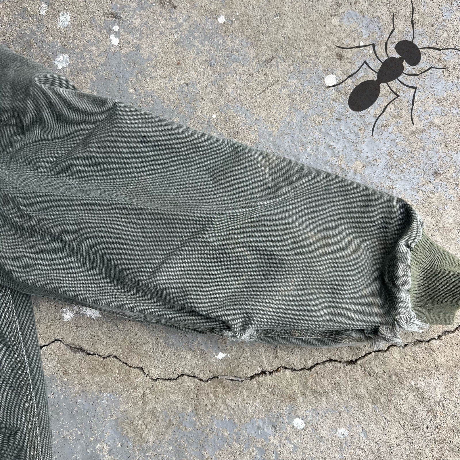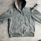 Vintage y2k green distressed camo lined carhartt hooded work wear jacket. Really cool wear on this one. Well loved. Nice camo lining. Measures 25x28.5. Please check measurements before purchasing. I do my best to show any flaws in pictures. Quick shipping! Bundles encouraged! @ants_haul on Instagram.