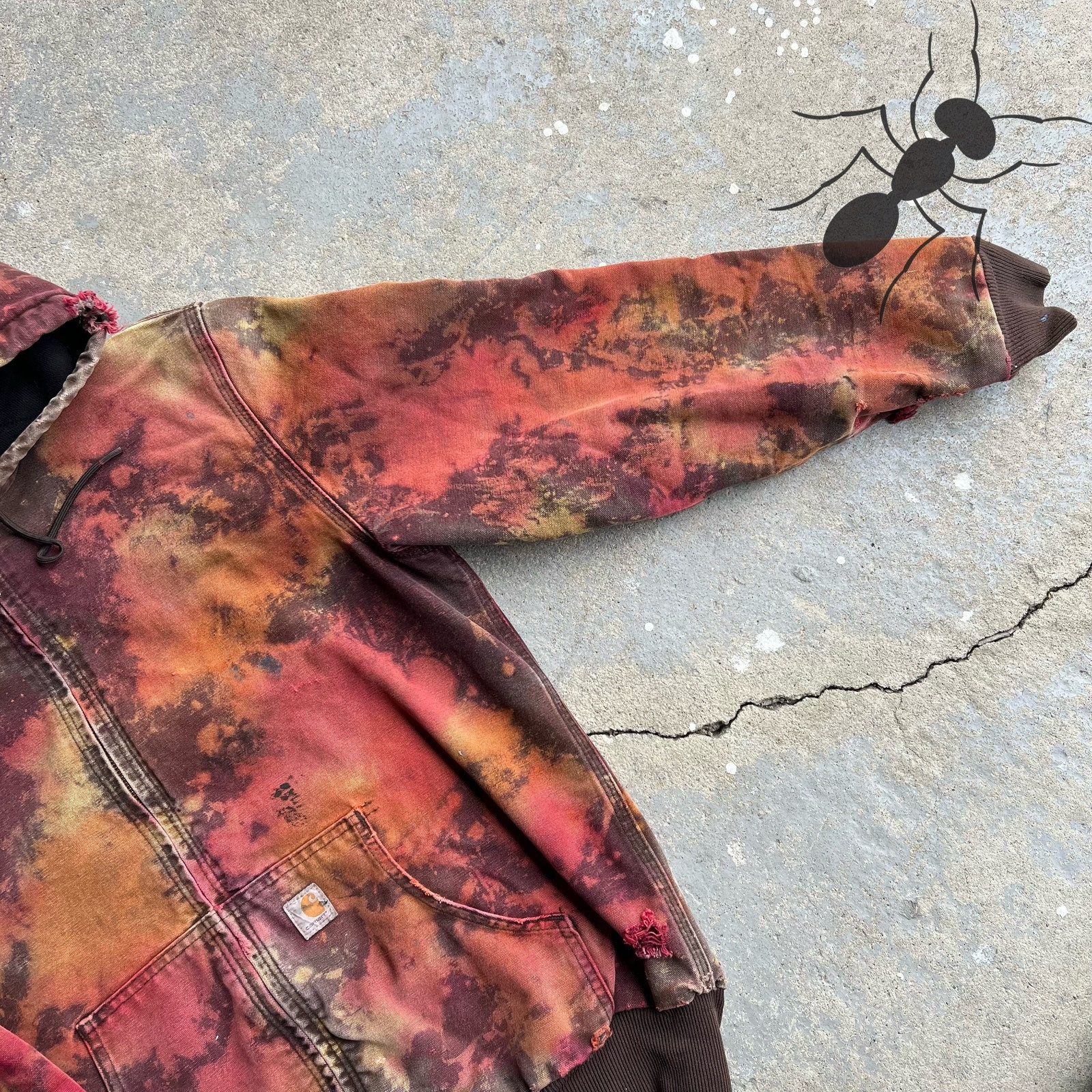 Vintage WOMENS y2k tie dye carhartt hooded work wear jacket. Pretty cool one never had something like this before. Smells like dye still youll want to give it a wash first. Cold wash it!!! Measures 22.5x28. Please check measurements before purchasing. I do my best to show any flaws in pictures. Quick shipping! Bundles encouraged! @ants_haul on Instagram.