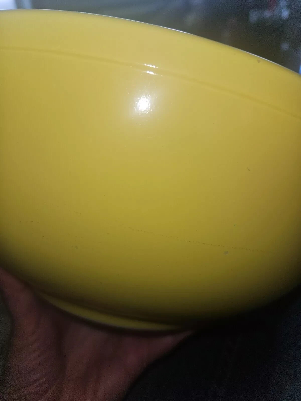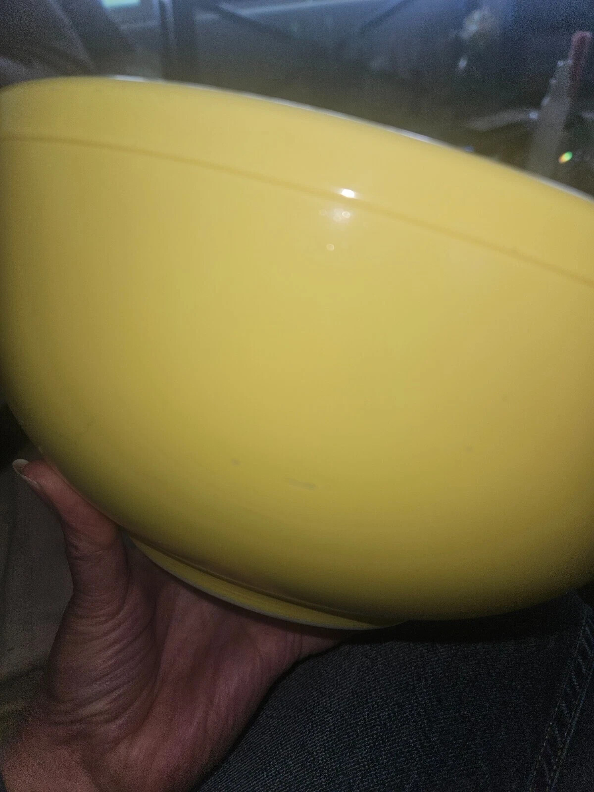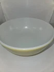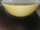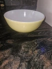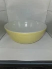 Vintage Pyrex Yellow Mixing Bowl Primary Color 4 quartEarly No Number TM Mark Please see pics for best condition. Two areas havescratches/scuffs. No chips or cracks.