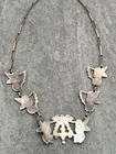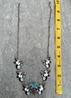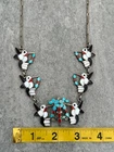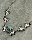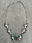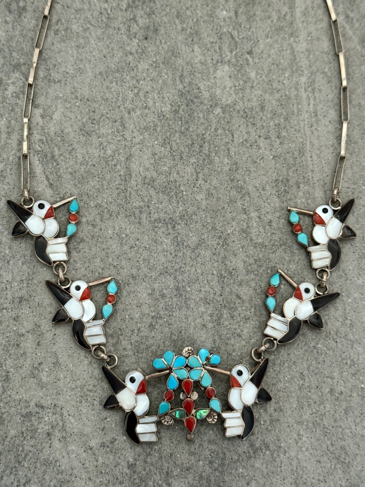 This is an eye-catching Old Vintage Zuni sterling silver necklace. This amazing, beautifully hand crafted inlaid Hummingbird necklace contains natural HAND CUT turquoise, coral MOP and onyx stones. There is no purity mark, however it has been tested positive for sterling silver. *EACH PIECE OF OUR COLLECTION IS CLEANSED WITH WHITE SAGE INCENSE. ADJUSTABLE NECKLACE!!! ***THIS NECKLACE IS A GREAT EXAMPLE FOR SKILLFUL CRAFTSMANSHIP & TIMELESS ELEGANCE!!! Approximate length of the necklace is 20" in total (with center piece section and hook). Approx: Center piece section 2-1/4" Sturdy 25grams in my scale. This Necklace would be a great addition to any Native American or Southwestern jewelry collection. Also this amazing bracelet is a timeless beauty with lots of good energy! SMOKE AND PET FREE ENVIRONMENT. If you have any question please contact me via eBay messages and PLEASE CHECK MY OTHER LISTINGS AS WELL! THANK YOU FOR STOPPING BY!