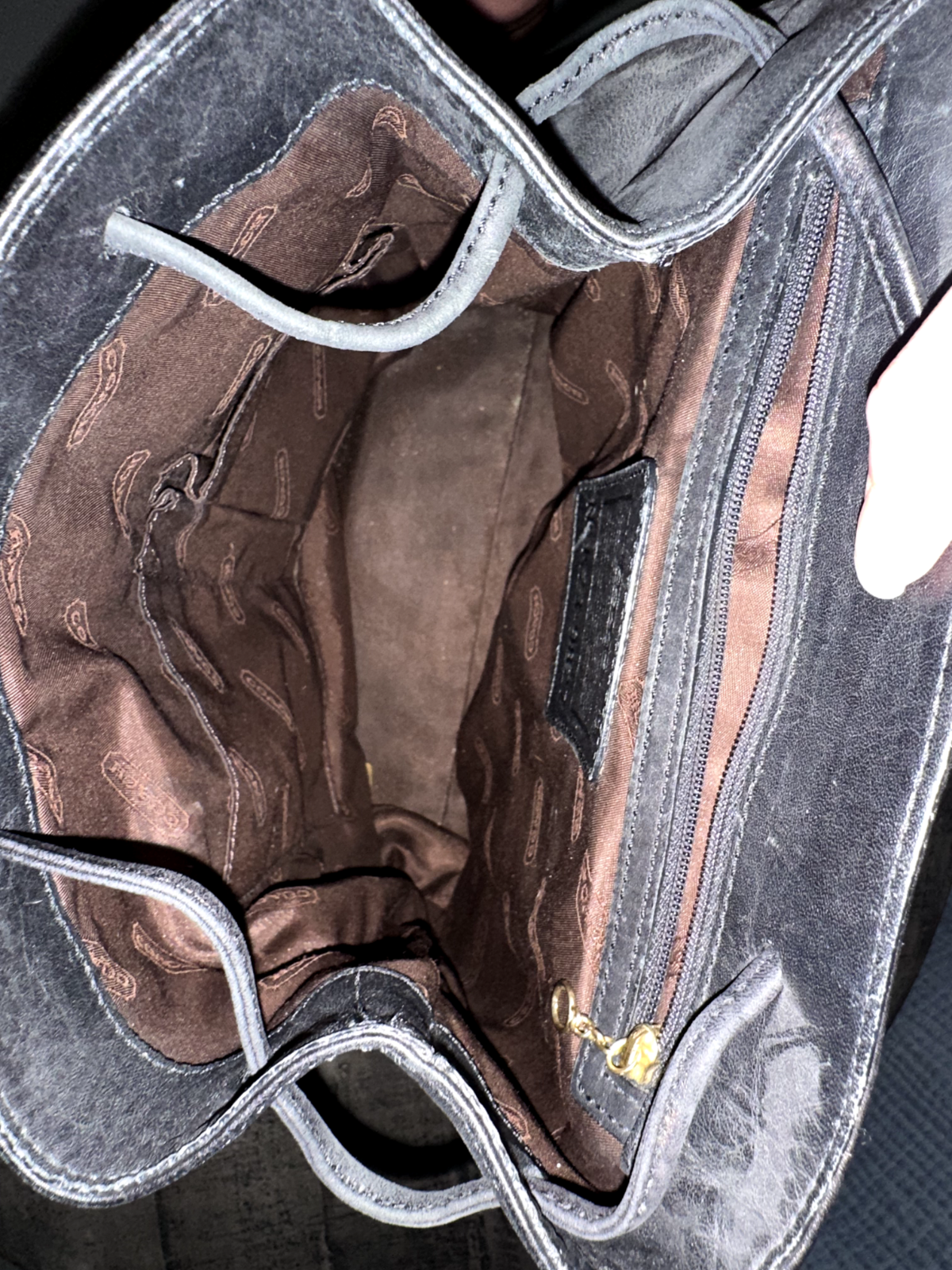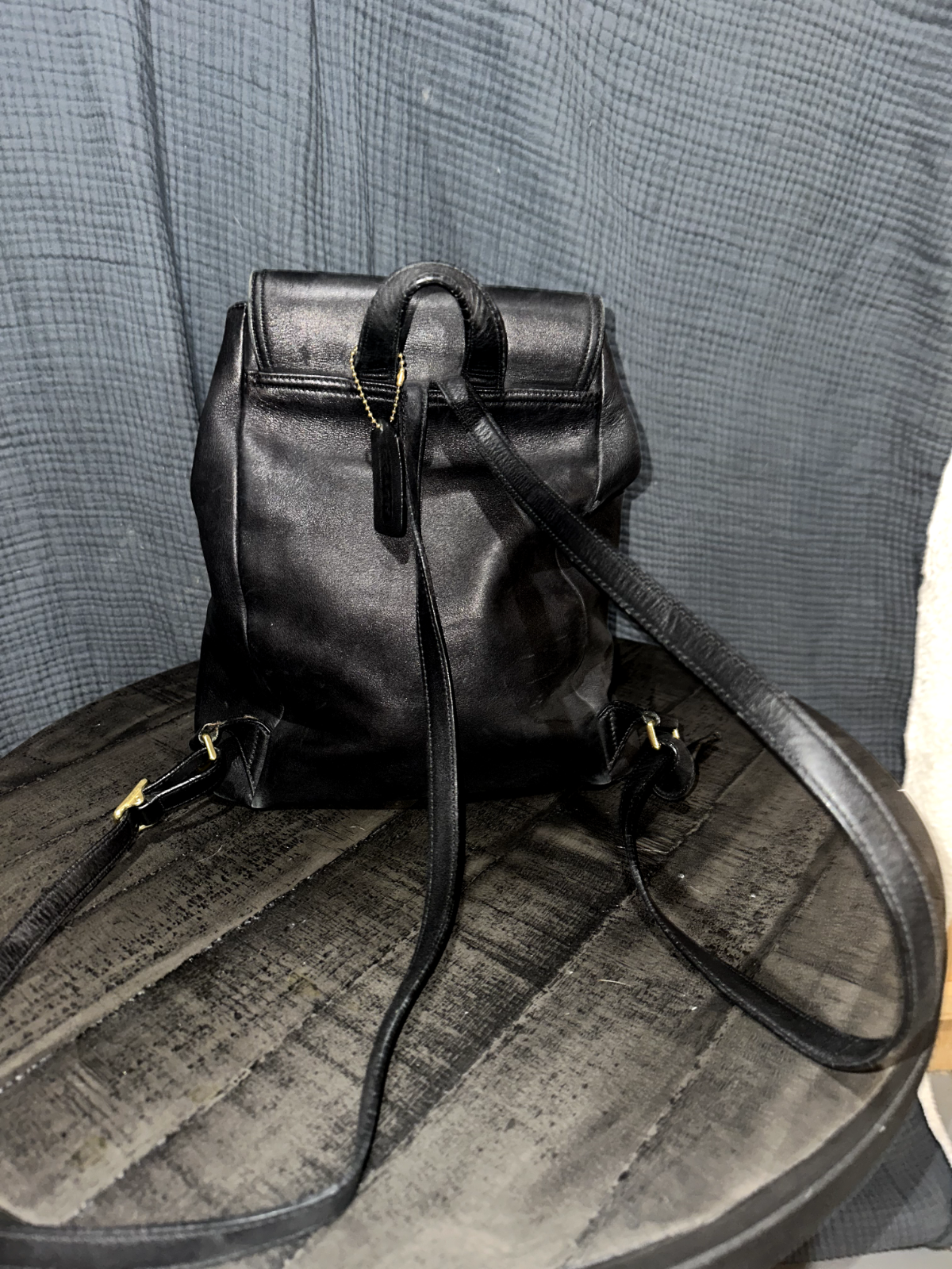 This is a black leather Coach backpack with a vintage style.