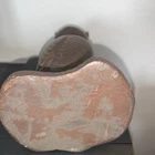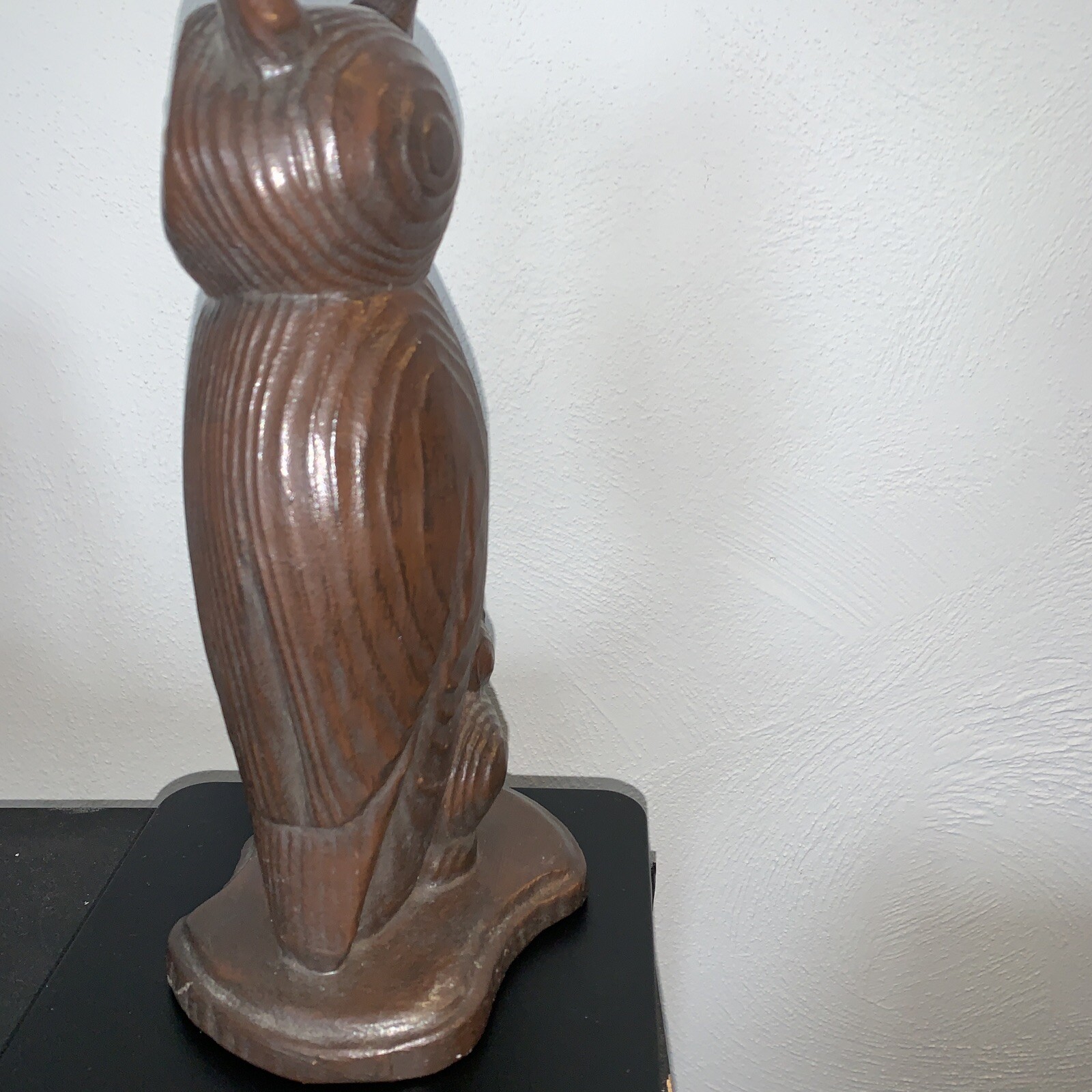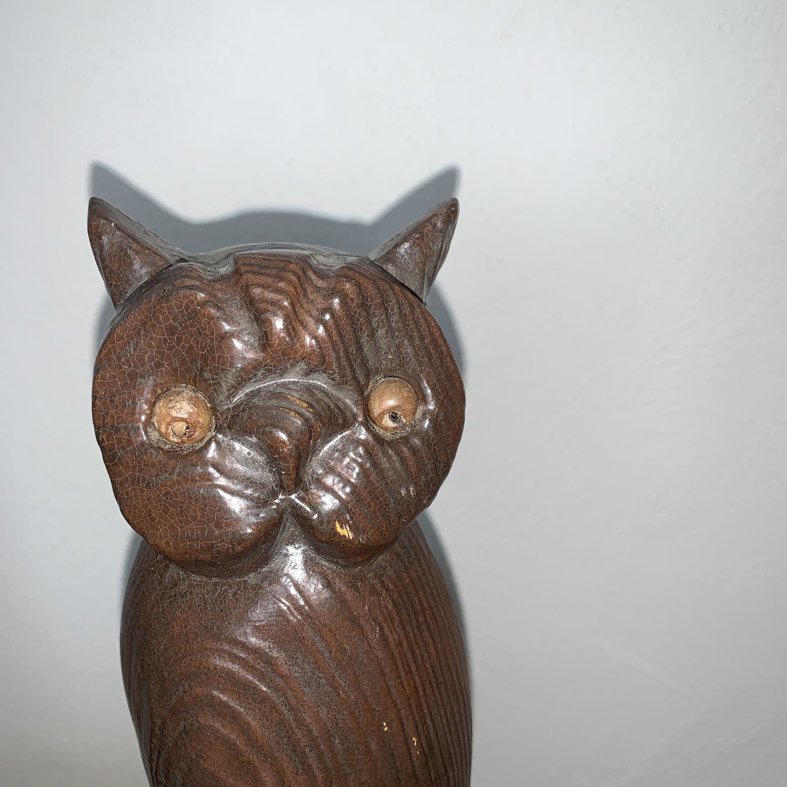 Ceramic Owl figurine Vintage Chalk-ware Faux Wood Textured Mother and Baby Owl Art Figure With Bead eyes - See photos. This brown figure is heavy, made to look like carved wood. The baby owl is peaking from behind its mother. 9.5" tall 2 lbs, 2 oz.