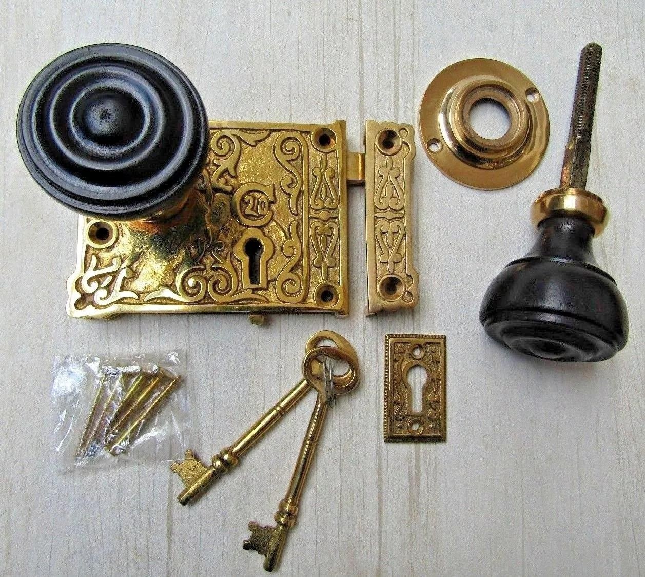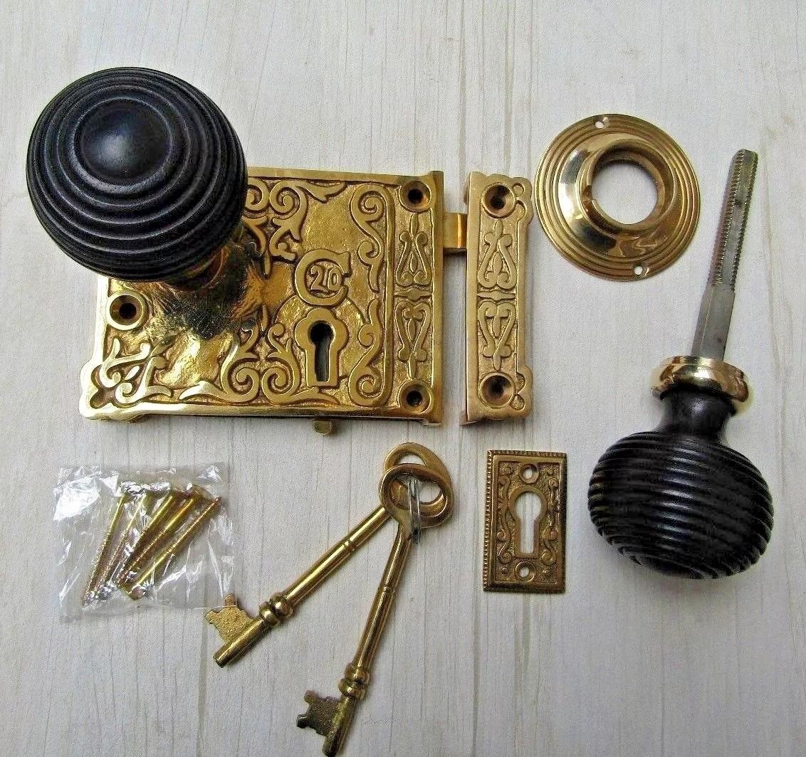 Solid brass rim lock with wood and brass rim knob set Please select the required pattern from the above drop down selections bar Designed for internal usage WOODEN BEEHIVE KNOB DIAMETER 50MM ROSE 65MM DEPTH 60MM WOODEN BUN RIMMED -KNOB DIAMETER 55MM ROSE 65MM DEPTH 60MM WOODEN PLAIN BUN -KNOB DIAMETER 55MM ROSE 65MM DEPTH 60MM Rim lock 105mm x 80mm Keep 80mm x 20mm Edge of lock to centre of keyhole: 38mm Edge of lock to centre of square latch: 80mm These rim locks are surface mounted. Designed for bathroom & bedroom doors or rooms requiring privacy. Please note that these rim locks are reversible and can be fitted to both left and right hand opening doors. The locks with keyholes can be locked from either side of the door.
