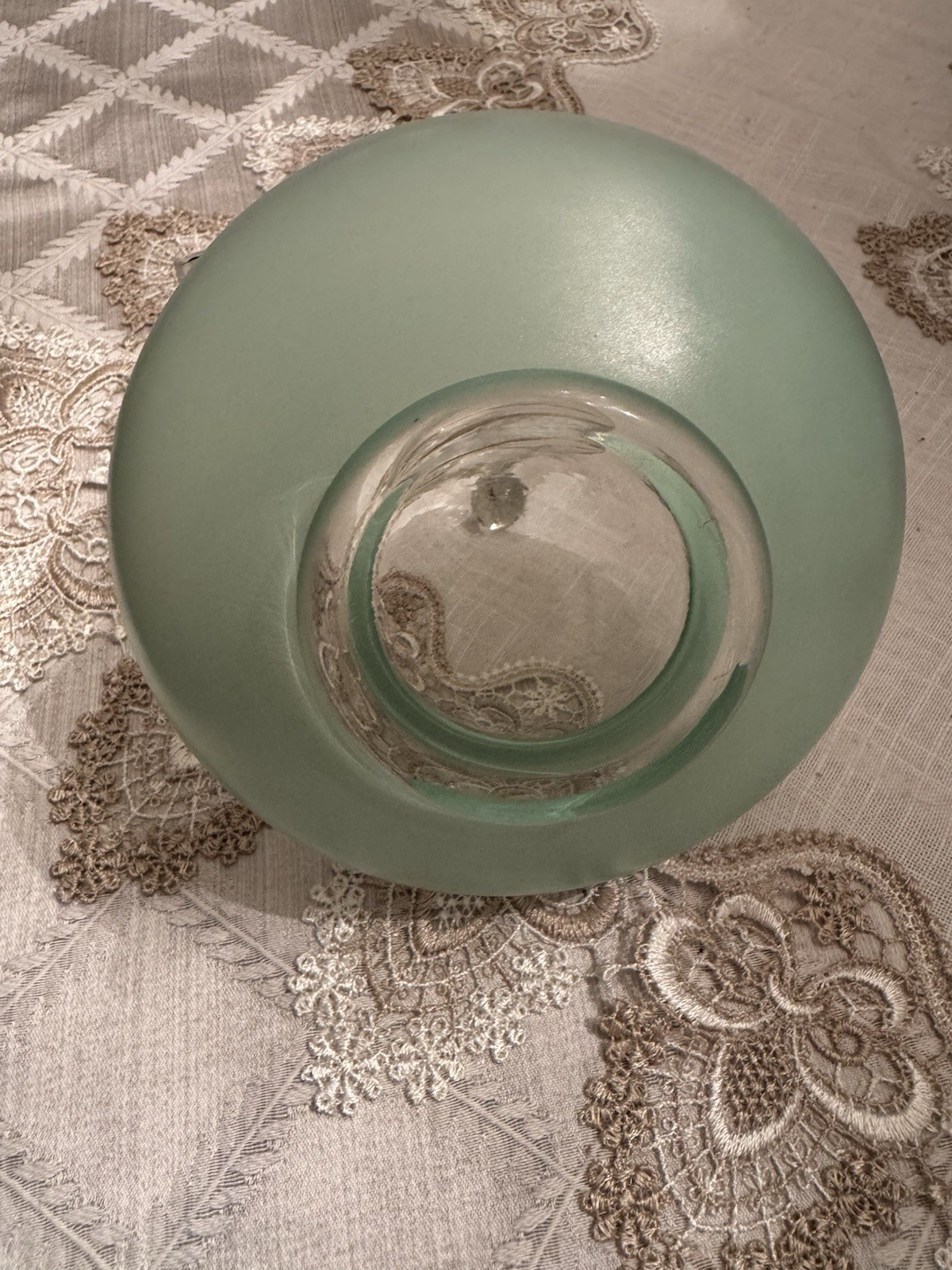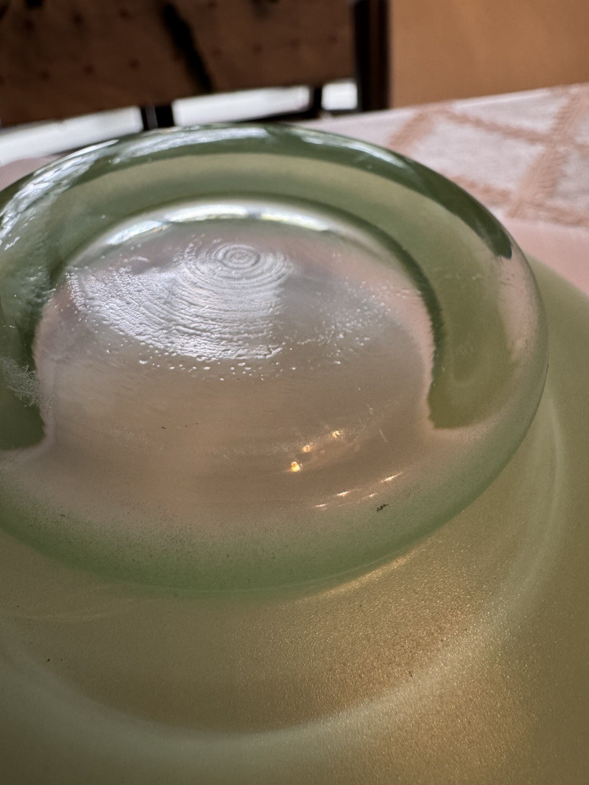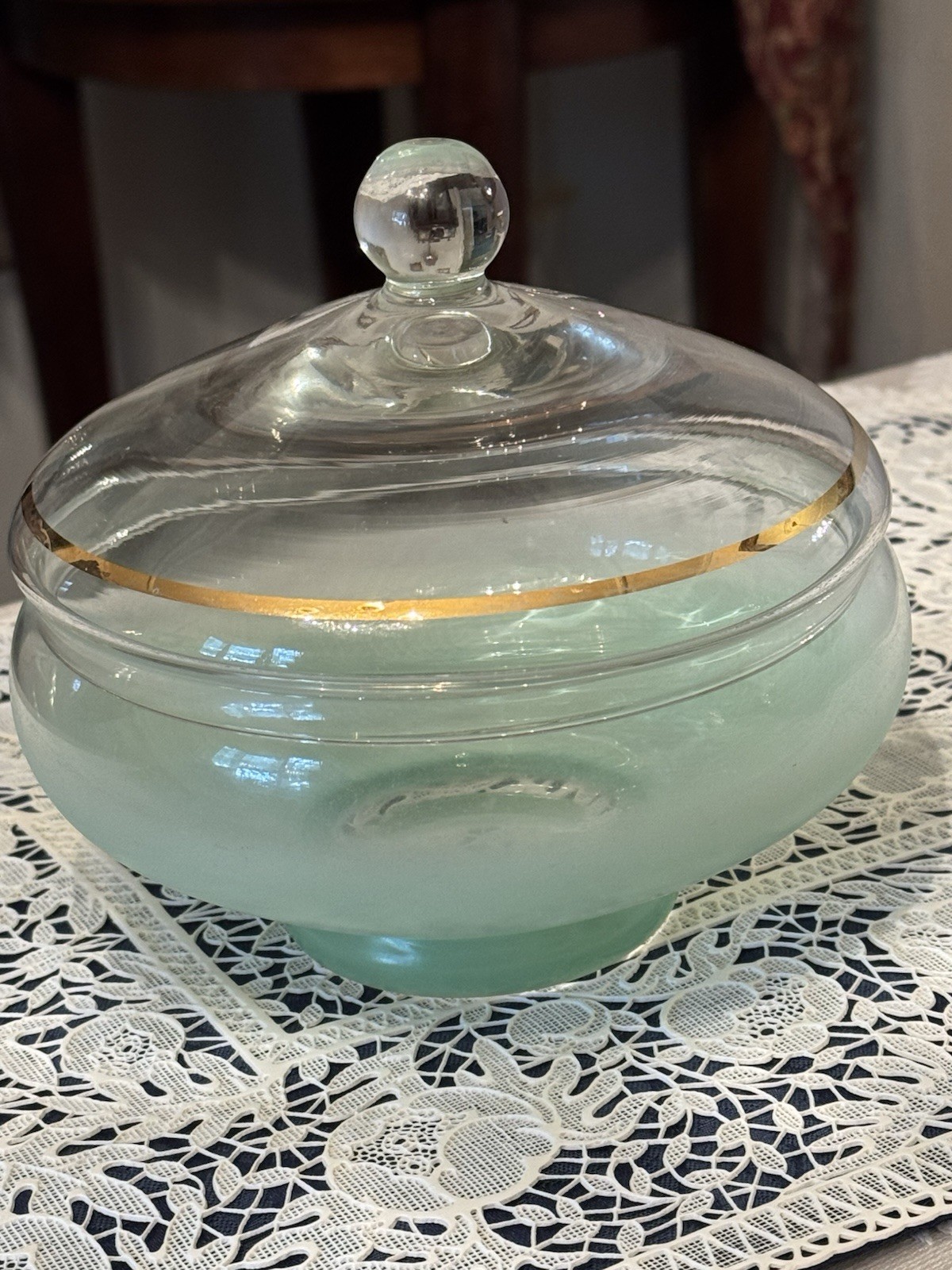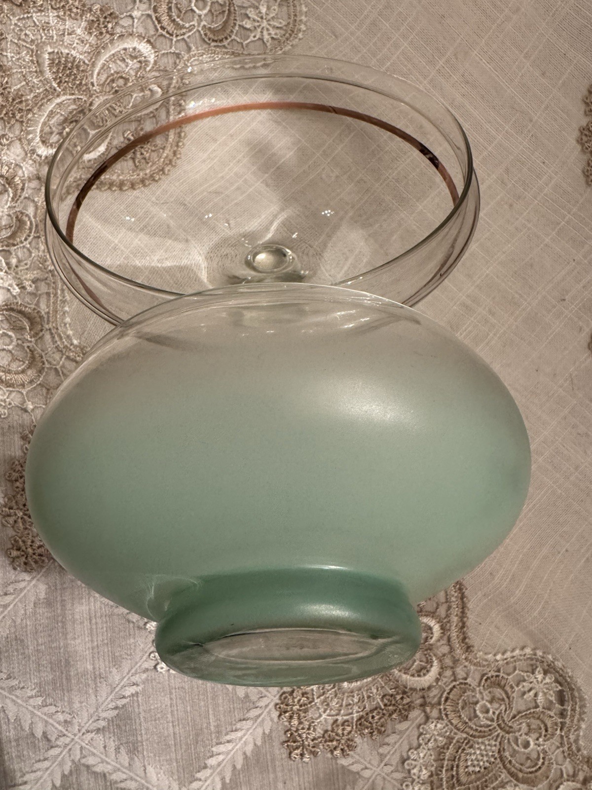 Unique, Beautiful Vintage pale green Satan glass bowl that fades to clear towards a gold rimmed glass ball top (glass ball shows UV color change); the glass pontil mark is smooth on bottom indicating fine workmanship but the glass is otherwise not marked. Ive not seen another just like this - a special piece-approximately 6” high by 6” deep which was probably made in the early 1900’s - 1930’s based on Uranium presence. In great condition with no scratches or chips and the gold rim is intact.