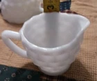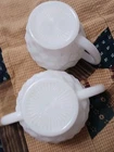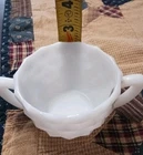 This Vintage Milk Glass Cream and Sugar Set from the 1950s features a round shape with a medium size and white color. The set includes a creamer and sugar bowl with handles, both made of glass. This original collectible set is perfect for all occasions and is handmade in the United States. The set is unboxed and should be hand washed for care. Perfect for collectors of vintage kitchenware or those looking to add a touch of retro charm to their dining experience. Very nice set no chips great condition
