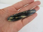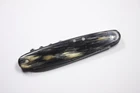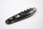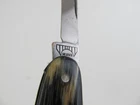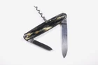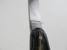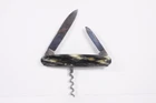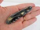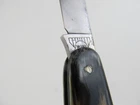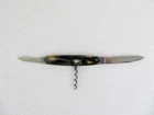 ...pocket knife, 2 knives, corkscrew A good looking knife by E Bruckmann, Solingen-O, with a main knife, smaller knife and bottle opener, it is a good basic for a picnic hamper, to go fishing, for a bartender, or to have handy for small jobs. In good vintage condition with some discoloration to the main blade. All pieces fold out easily. The sides look like polished steer (Cow) horn and have marks of age and use. Size (folded) 3-1/4 inches // 8.3 cm long. main blade 2-5/8 inches // 6.7 cm long.