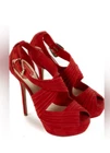 Red suede Dior heels in size 10 feature a platform style with a peep toe design. These elegant women's shoes are perfect for adding a pop of color to your outfit while also providing a stylish and comfortable elevated heel option.